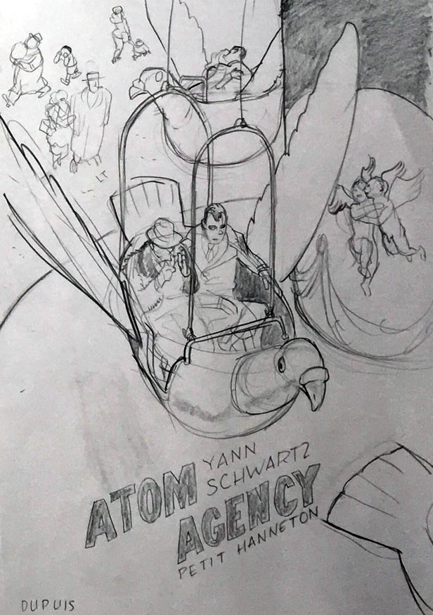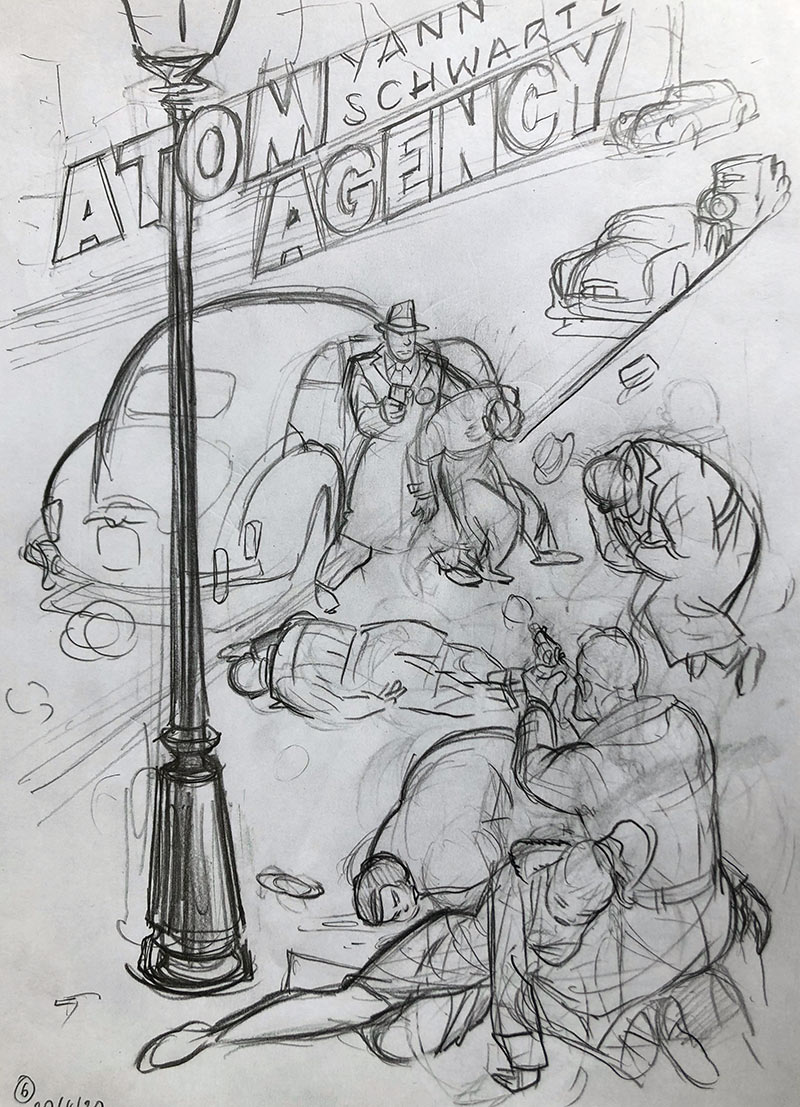 Scwhartz : Je voulais travailler avec lui après avoir été estomaqué par ses couleurs sur le Spirou de Yoann et Vehlmann. Il parvenait à mettre de la profondeur dans ses couleurs, avec de subtils dégradés, mais tout en restant dans le domaine de l’aplat. Ses teintes résumaient parfaitement l’époque d’Atom agency. On avait l’impression de voir un film de Pierre Granier-Deferre en couleurs, mais sans que cela soit choquant ! Hubert avait déjà réalisé une vingtaine de pages de Petit Hanneton avant de nous quitter. Bravo à Isabelle Merlet qui a pris la suite tout en parvenant à exprimer sa propre personnalité.