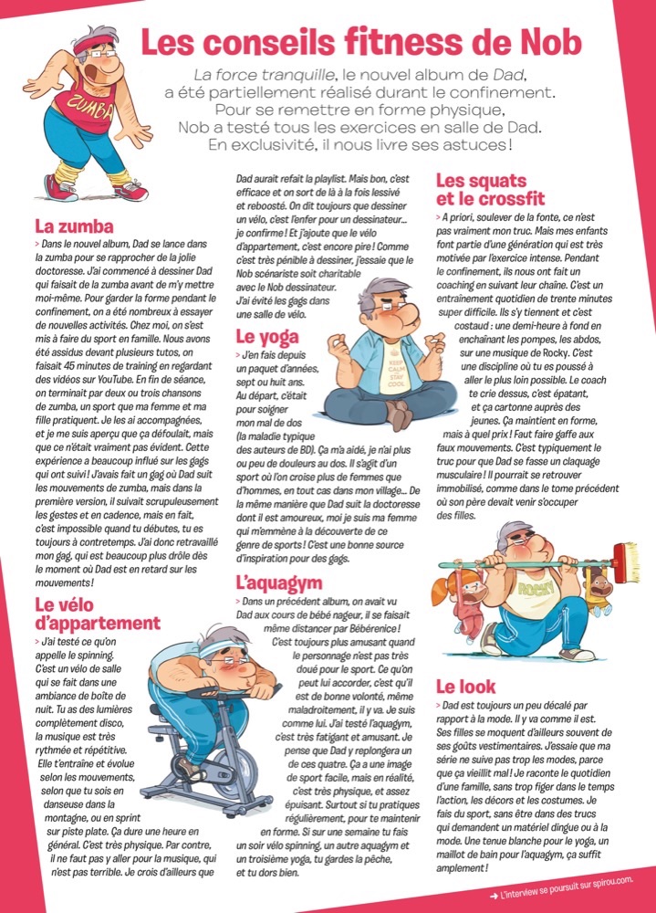 « La force tranquille », le nouvel album de Dad dont vous avez déjà découvert des pages dans le journal Spirou, a été partiellement réalisé durant le confinement. Pour se remettre en forme physique, Nob a testé tous les exercices en salle de Dad. En exclusivité, il nous livre ses astuces !