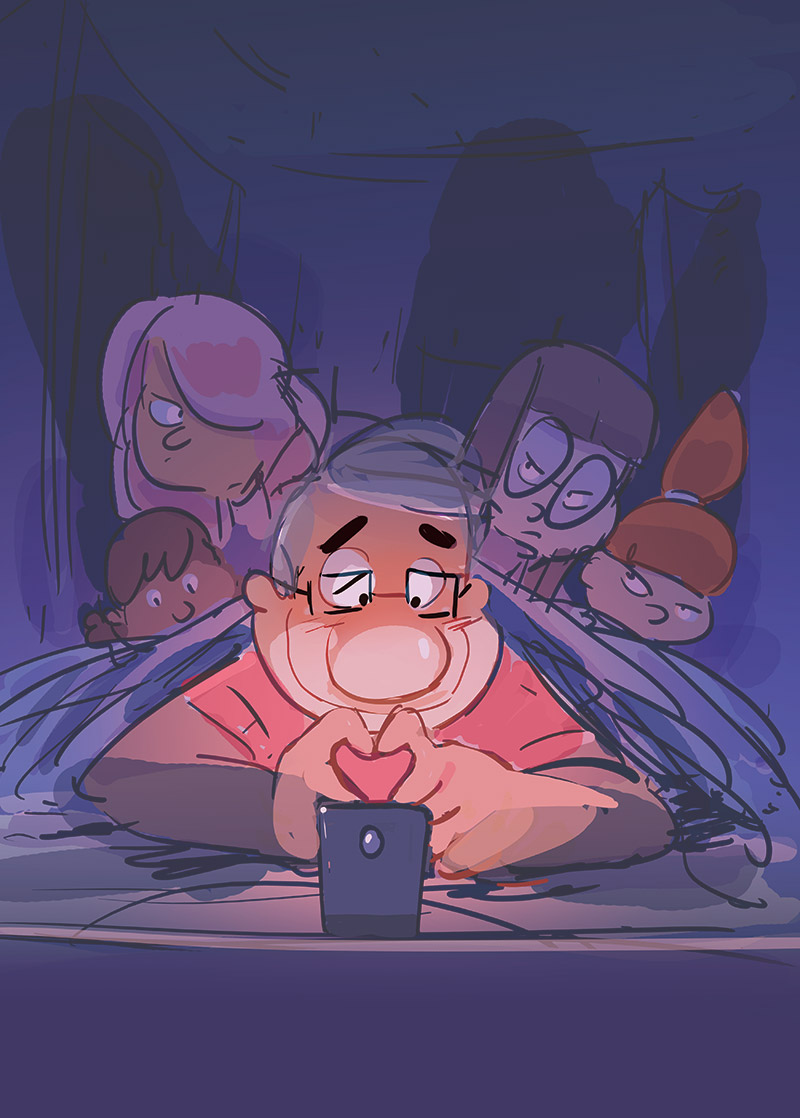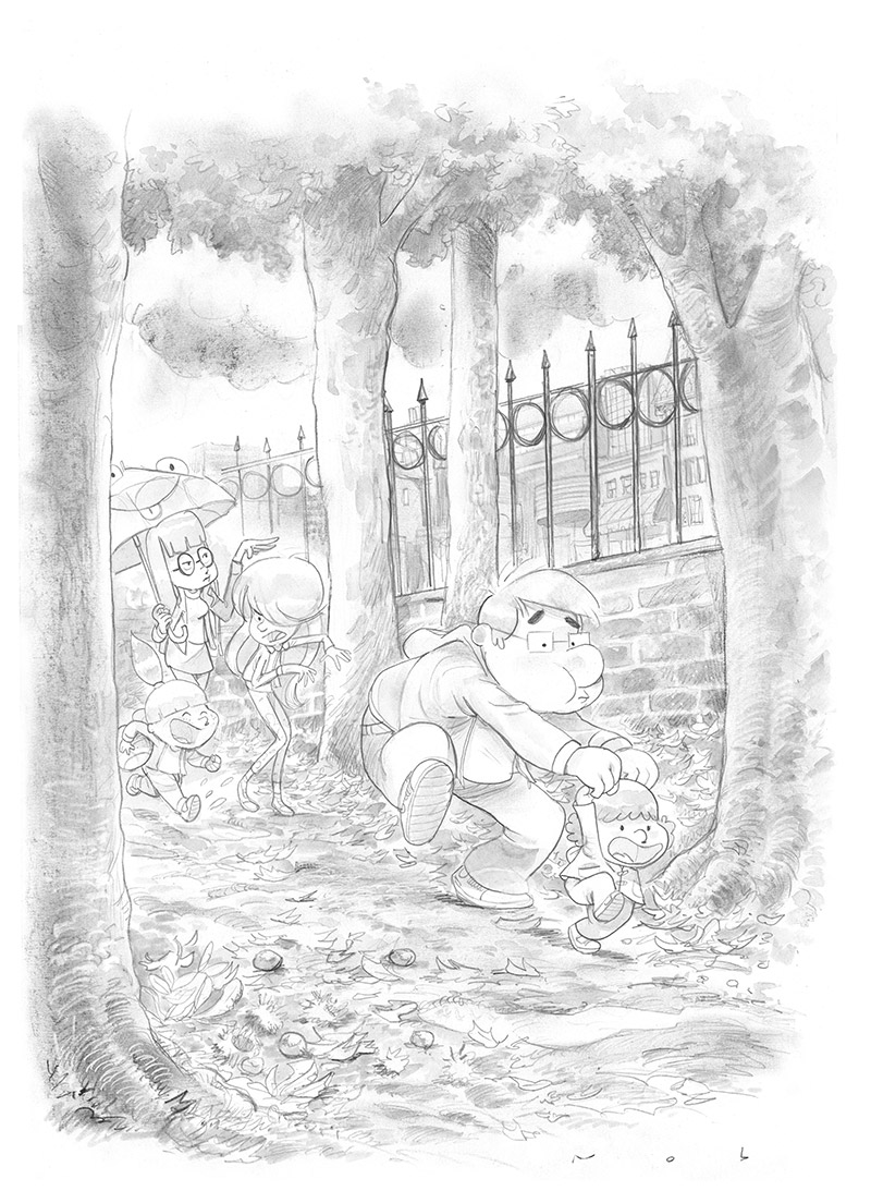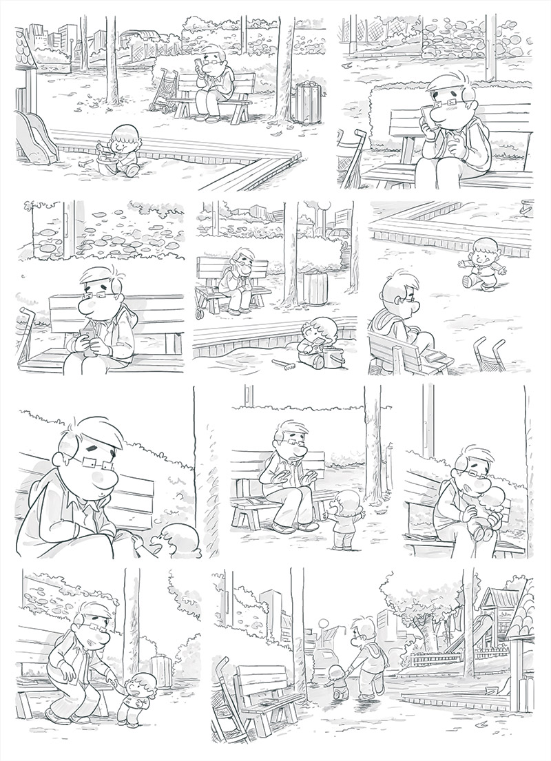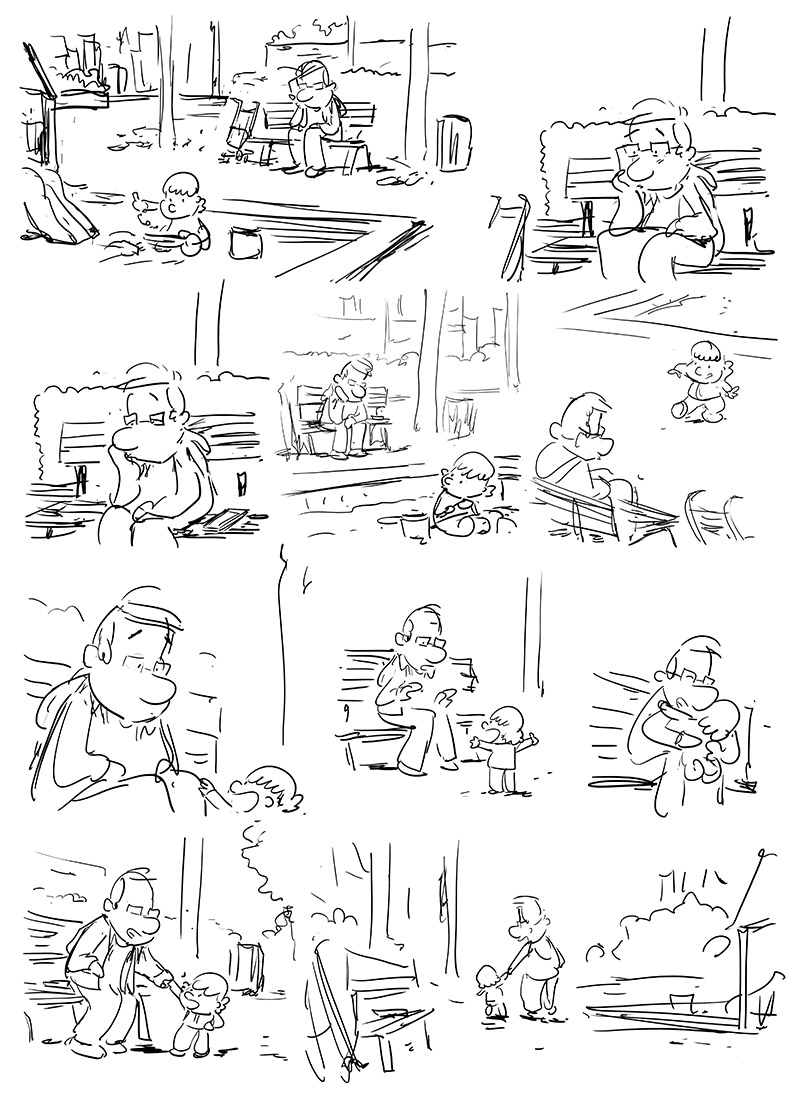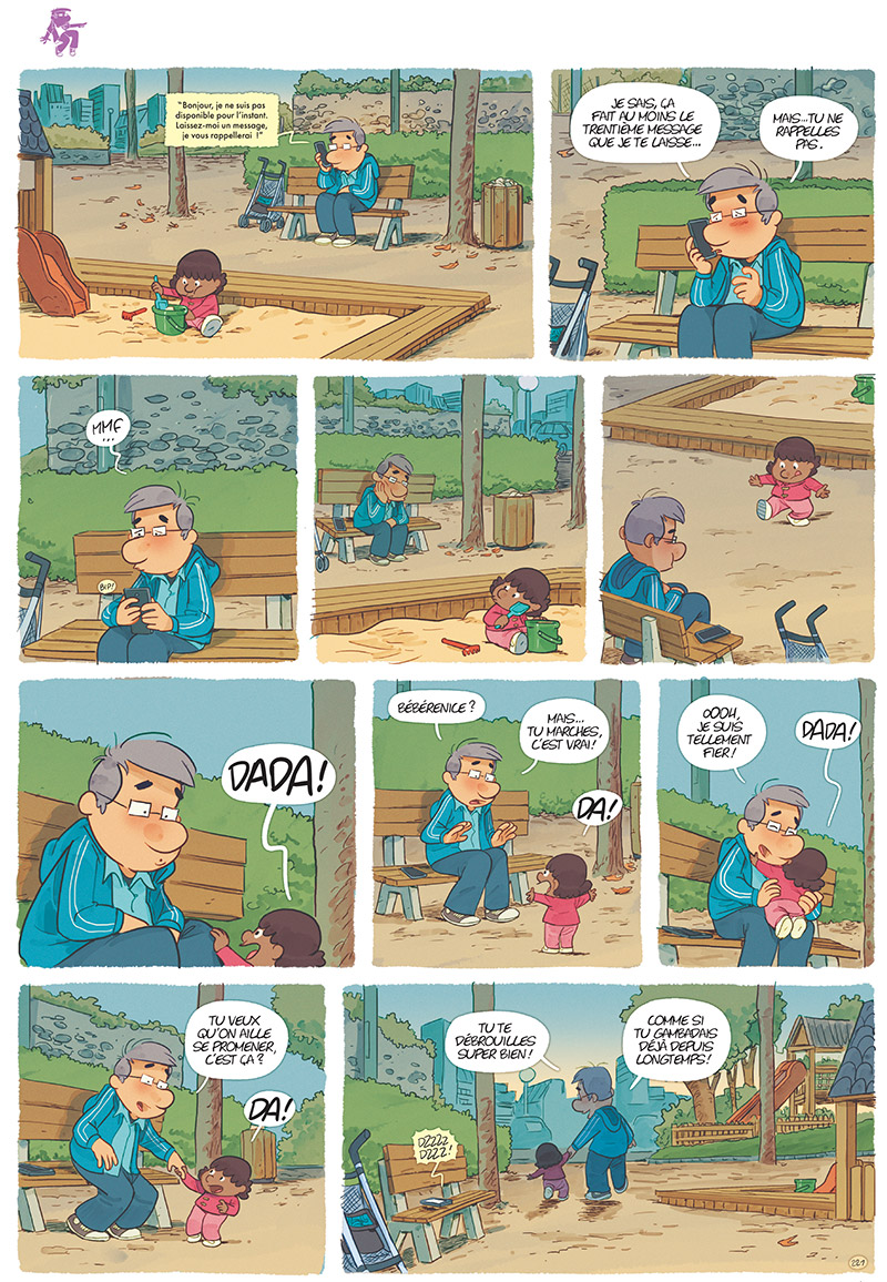 « Je le dessine de temps en temps enfant mais je ne pense pas que je ferai une série dans laquelle Dad serait enfant. Désolé pour l’ascenseur émotionnel provoqué par ce titre racoleur ! Mais c’est vrai que je trouve ça beaucoup plus drôle d’imaginer des flash-back que de faire vieillir les personnages. Par exemple, on connaît presque toutes les mamans des enfants de Dad mais on ne sait pas encore comment il était quand il était avec ces différentes mamans. »