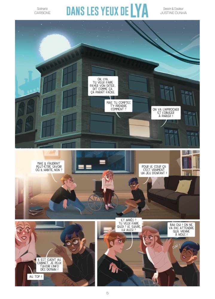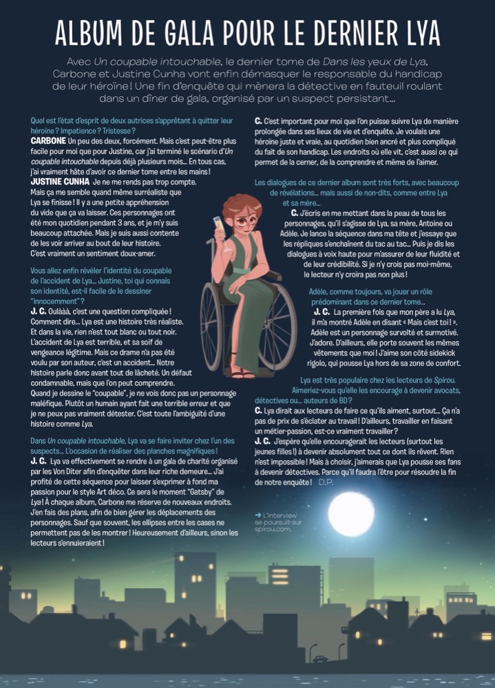 Avec « Un coupable intouchable », le dernier tome de Dans les yeux de Lya, Carbone et Justine Cunha vont enfin démasquer le responsable du handicap de leur héroïne ! Une fin d’enquête qui mènera la détective en fauteuil roulant dans un dîner de gala, organisé par un suspect persistant…