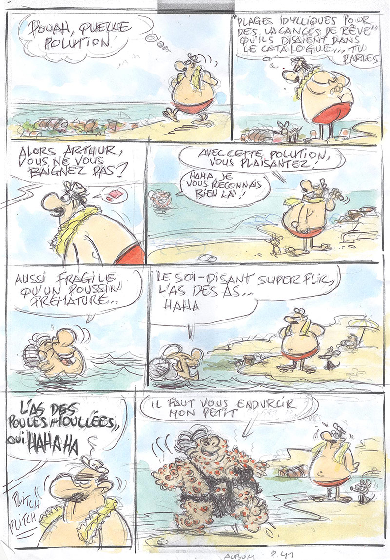 Kox : Cet uniforme est français sans l’être. Je me suis inspiré de l’uniforme de Longtarin, mais aussi de celui du policier dans Boule et Bill. Roba avait d’ailleurs commencé par donner à ce dernier un uniforme belge avant de l’abandonner. L’uniforme français fait plus « policier », ce doit être grâce au képi ! L’Agent 212 va donc garder sa tenue au moins pour les 40 prochaines années !