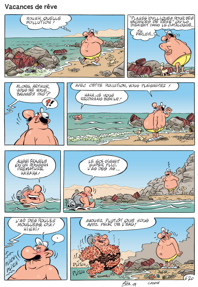 Kox : Je ne le fais pas exprès, je crois… J’utilise de la documentation, par exemple pour le commissariat où travaille l’Agent 212. Mais je simplifie tellement qu’à la fin je crée un univers qui m’est propre plutôt que de copier le vrai monde. Cela a des avantages, car ne pas coller au réel permet de faire ce que l’on veut sans choquer… Par exemple, quand je dessine l’agent tout nu je m’inspire du corps… d’un poulet ! Ainsi, cela ne révolte personne de voir un policier évoluer dans le plus simple appareil !