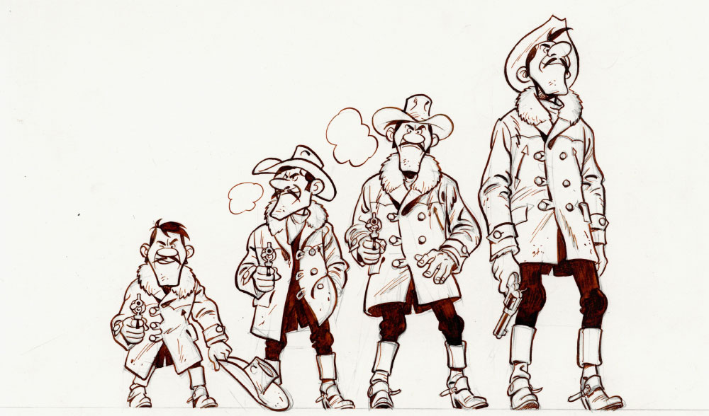 Dans mon précédent Lucky Luke, j’ai dessiné toute la bande de Joss Jamon en la caractérisant « à la Morris », mais en l’animant de manière semi-réaliste. Ça m’a débloqué pour les Dalton, que je ne pensais pas être capable d’utiliser dans mes albums. Joe et ses frères vont bien sûr générer des tas de situations comiques, qui ne seront pas sans rappeler celles des Dalton dans le blizzard, Canada oblige. Mais je vais aussi rappeler que ce sont de dangereux criminels, à ne pas prendre à la légère…