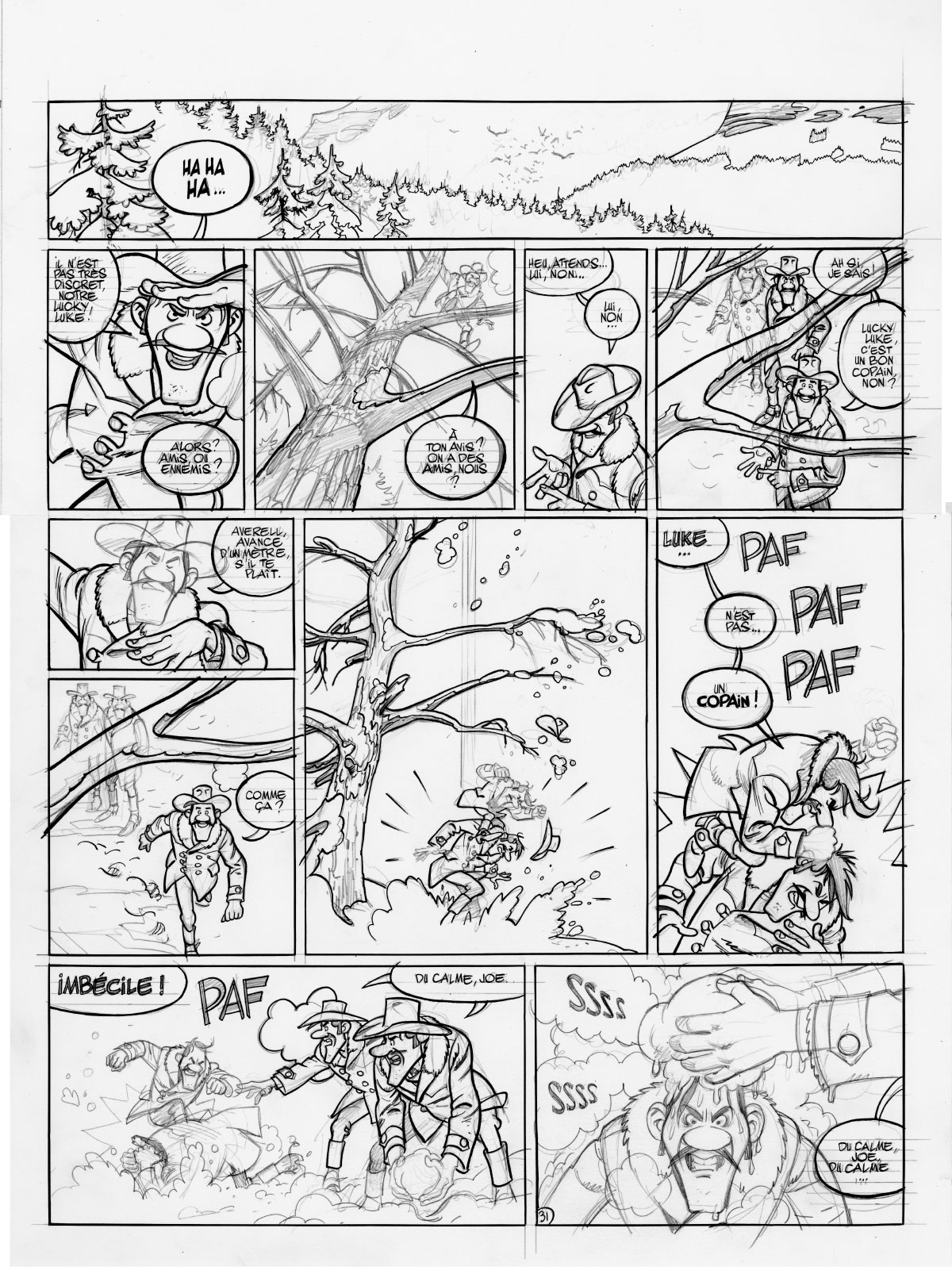 Dans mon précédent Lucky Luke, j’ai dessiné toute la bande de Joss Jamon en la caractérisant « à la Morris », mais en l’animant de manière semi-réaliste. Ça m’a débloqué pour les Dalton, que je ne pensais pas être capable d’utiliser dans mes albums. Joe et ses frères vont bien sûr générer des tas de situations comiques, qui ne seront pas sans rappeler celles des Dalton dans le blizzard, Canada oblige. Mais je vais aussi rappeler que ce sont de dangereux criminels, à ne pas prendre à la légère…