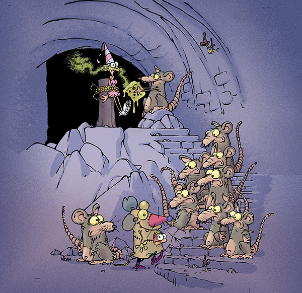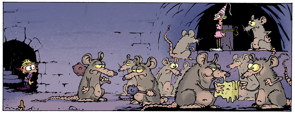 Cette histoire est construite comme un épisode de Bip Bip, avec le petit barbare qui tente de vaincre les rats à plusieurs reprises avant le dénouement final. Comme d’habitude, j’ai travaillé seul jusqu’à l’étape du story-board, puis je l’ai montré à Midam, avec qui j’ai discuté d’éventuelles améliorations. Dans ma première version, c’était un vieux rat sourd qui faisait échouer l’enchantement de la flûte. L’histoire se terminait ensuite sur les rats rongeant les fils électriques de l’interrupteur ouvrant la porte « Exit ». La case 2 préparait cette chute abandonnée, mais nous l’avons gardée car elle ne gênait pas la narration.