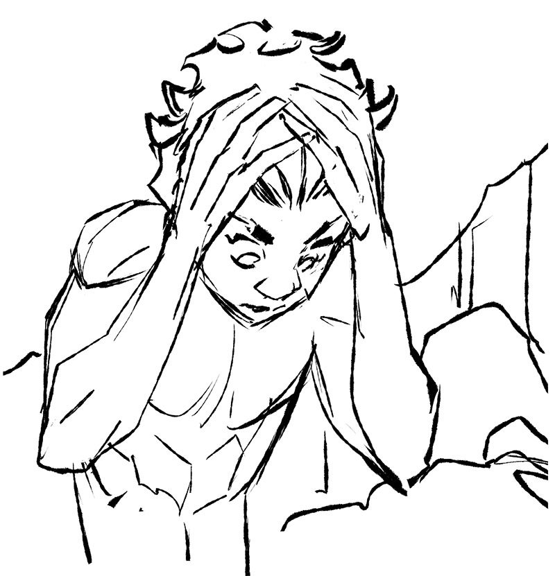 Les scènes de dialogues sont plus compliquées que ce que l’on imagine, car il faut réussir à ne pas ennuyer le lecteur malgré la position souvent statique des personnages. Les dialogues, écrits par Émilie Alibert, ont beaucoup d’importance dans mon travail. Ils sont très précis et spontanés, permettent de bien comprendre les personnages et conditionnent donc mon dessin. Le dessin, c’est de l’acting. Et les dialogues sont donc ce qui va conditionner les visages et l’attitude.