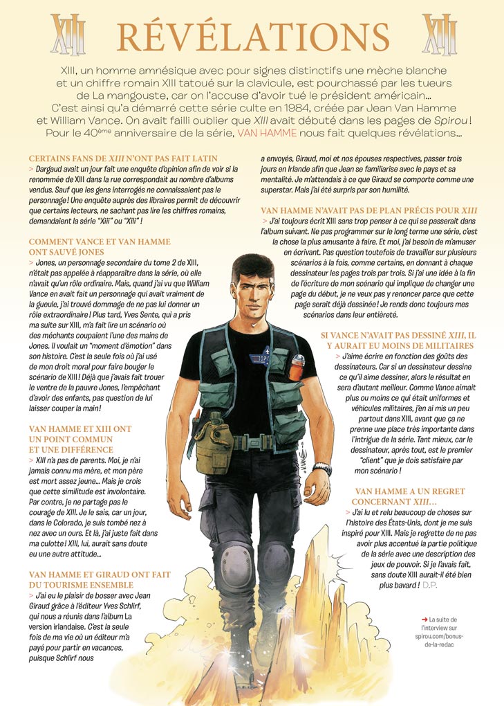 Cette semaine, le journal Spirou célèbre les 40 ans de XIII, la série culte créée par Jean Van Hamme et William Vance et qui, on vous le rappelle, a fait ses débuts en 1984 dans les pages de SPIROU ! Eh oui !
