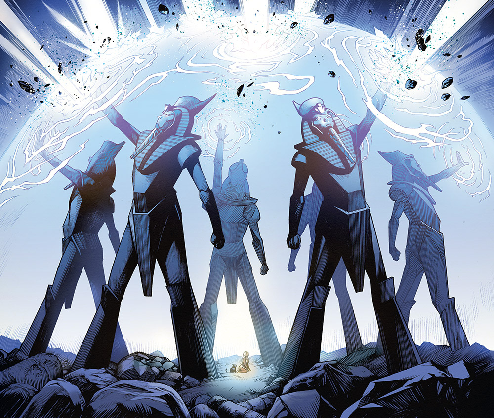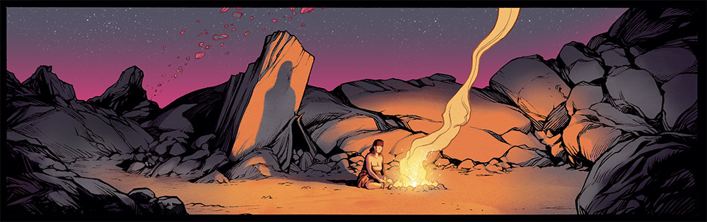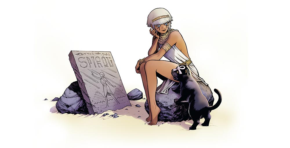 Stéphane Perger : J’ai beaucoup de scènes de foule à mettre en images, avec en particulier des colonnes d’esclaves sur plusieurs pages. Architecturalement, il y a une mine un peu étrange à dessiner, avec des designs assez complexes. Puisque Tanis quitte l’Égypte, j’ai dû m’imprégner de nouvelles cultures, par exemple celle de la Mésopotamie. Comme il reste peu de traces de leur vie quotidienne, il y avait un grand travail d’imagination à faire ! La chose la plus facile à dessiner sur ces nouvelles pages ? La roche, car j’adore faire ça !