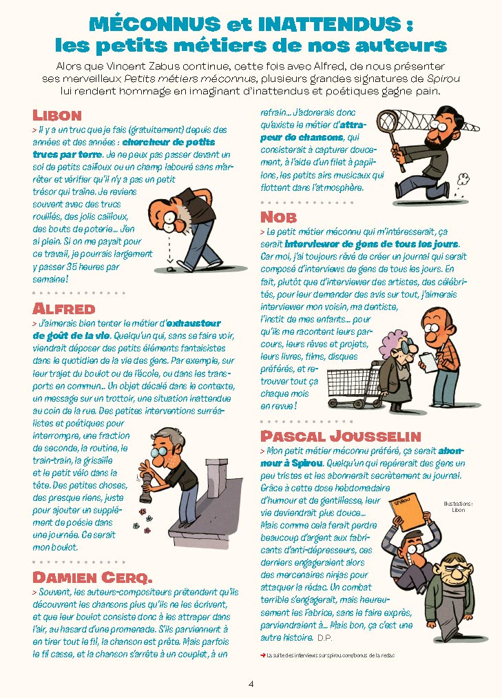 Alors que Vincent Zabus continue, cette fois avec Alfred, de nous présenter ses merveilleux « Petits métiers méconnus », plusieurs grandes signatures de SPIROU lui rendent hommage cette semaine en imaginant d’inattendus et poétiques gagne-pain.