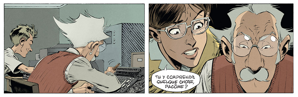 David Etien : Champignac intériorise beaucoup ses émotions. Pour les premières recherches sur la série, je lui avais donné des expressions plus poussées, mais cela ne fonctionnait pas, graphiquement, surtout à cause de sa moustache ! Depuis, afin de montrer quels sentiments l’agitent, je passe par les yeux, les sourcils ou encore les cadrages, par exemple en « écrasant » Champignac sous une plongée.