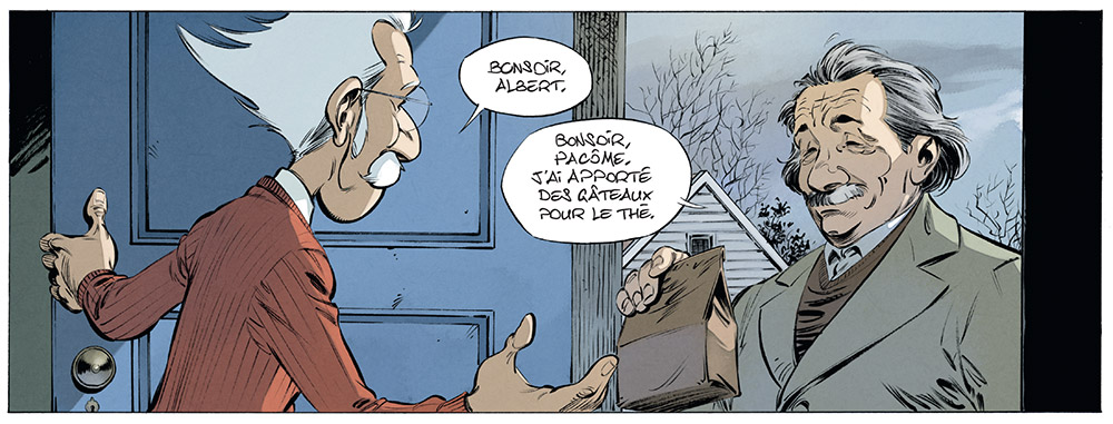 Beka : Einstein va rencontrer Champignac au début des Années noires. Tout ce que je lui fais dire est authentique. Comme pour tous les personnages historiques de cet album, j’ai lu des biographies, des articles et consulté énormément de sources ! Il n’est pas impossible que Franquin se soit inspiré d’Einstein pour inventer Champignac, qui sait ? Ils ont ce même côté humaniste, mais aussi des cotés sombres que l’on a découverts plus tardivement. Einstein est également un peu désabusé quant à la nature du monde, comme l’est Champignac, même si c’est pour des raisons différentes.
