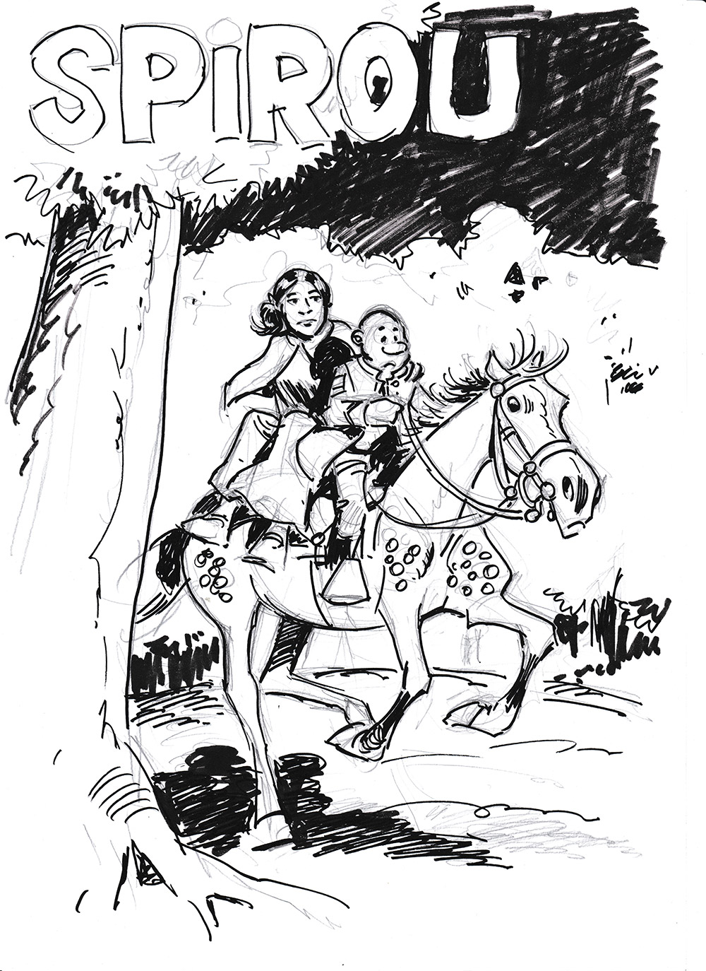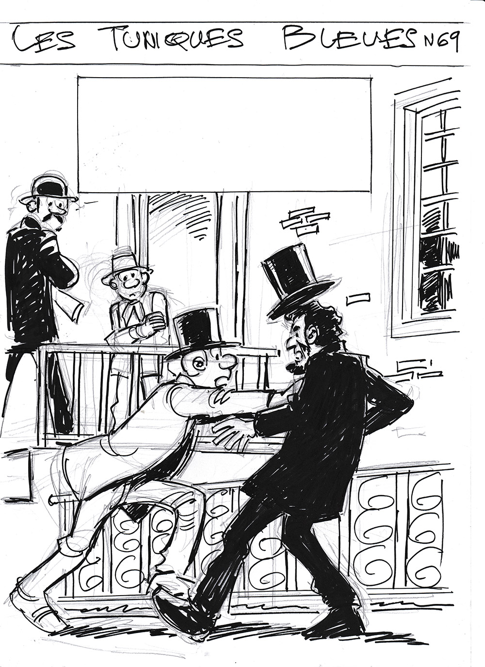 Travailler avec Lambil, c’est un rêve de gosse pour moi qui suis fan de son travail depuis toujours. Et c’est une belle aventure humaine. Il a l’âge de mon papa, ancien lecteur de SPIROU, qui m’avait abonné au journal quand j’avais 8 ans. C’est un plaisir d’échanger avec lui, il y a un côté transgénérationnel qui est l’âme du journal Spirou. Un journal dont je garde précieusement tous les numéros, depuis le premier de 1938. Je me régale à lui proposer notamment des scènes de nuit, pour lesquelles il excelle. Tout le monde connaît bien sûr les Tuniques Bleues en couleurs (sinon elles seraient blanches), mais les planches originales de Lambil sont très belles, il maîtrise l’équilibre des noirs et des blancs avec une science héritée des grands maîtres américains et de Jijé.