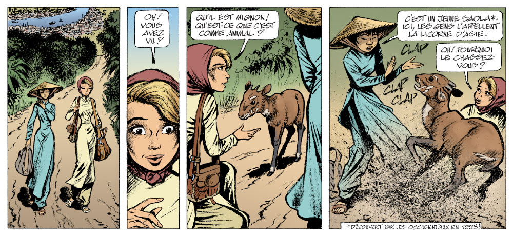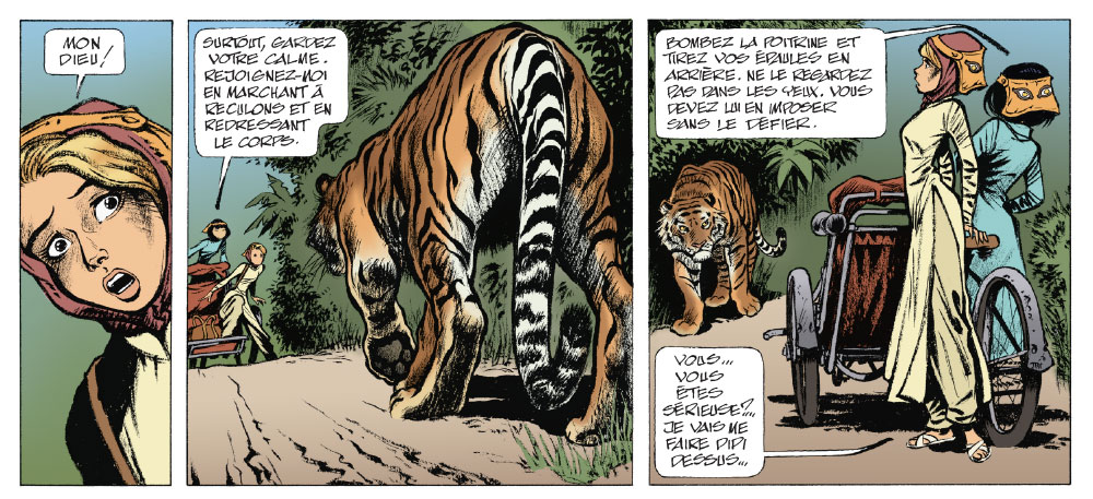 Laurent Verron : Yves Sente, le scénariste de Mademoiselle J, avait envie de changer d’ambiance après un album se déroulant en Russie. Il avait sans doute besoin de chaleur, puisque Juliette se retrouve cette fois dans la jungle vietnamienne. Quelle aubaine pour un dessinateur ! J’ai passé beaucoup de temps à me documenter sur l’Indochine, ancienne colonie française, afin de dessiner au mieux les endroits réels qu’Yves a mis dans son scénario. Surprise : de nombreux bâtiments ont été construits dans un style européen, ce qui donne à certaines planches une sorte de dépaysement décalé.
