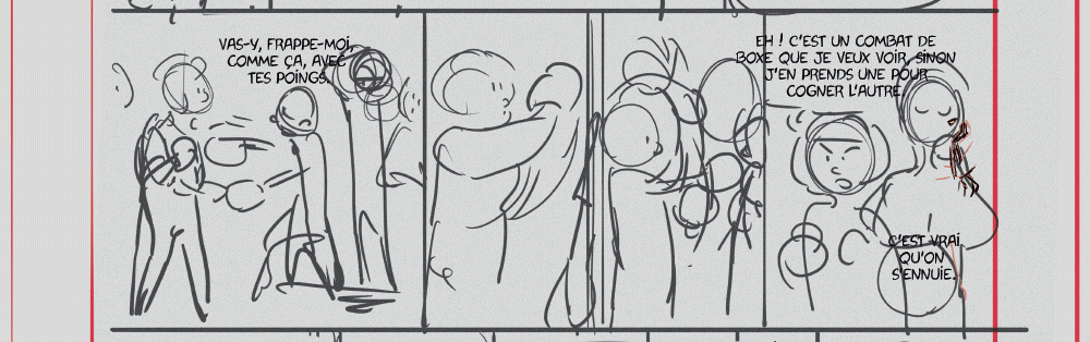 Véro Cazot : Écrire des scènes de combat, c’est hyper compliqué pour moi qui n’ai jamais fait de boxe ! Il n’y a pas tant de place que ça dans une page de BD. Et pourtant, il faut y faire rentrer du rythme et des enchaînements de coups cohérents, tout en veillant à ce que les lectrices et lecteurs ne s’ennuient pas. Contrainte supplémentaire : dans Mi-Mouche, les coups reçus et donnés sont plus que cela, puisqu’ils résument des enjeux émotionnels précis. Pour m’aider, je regarde sur Internet des entraînements de boxeurs et boxeuses adolescents.