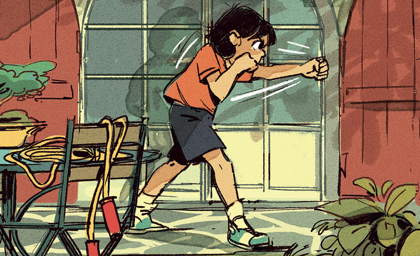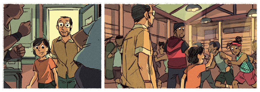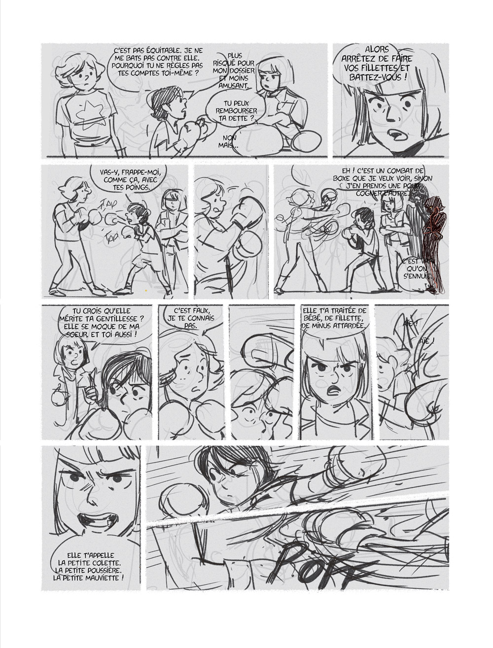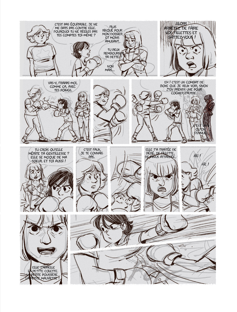 Véro Cazot : Écrire des scènes de combat, c’est hyper compliqué pour moi qui n’ai jamais fait de boxe ! Il n’y a pas tant de place que ça dans une page de BD. Et pourtant, il faut y faire rentrer du rythme et des enchaînements de coups cohérents, tout en veillant à ce que les lectrices et lecteurs ne s’ennuient pas. Contrainte supplémentaire : dans Mi-Mouche, les coups reçus et donnés sont plus que cela, puisqu’ils résument des enjeux émotionnels précis. Pour m’aider, je regarde sur Internet des entraînements de boxeurs et boxeuses adolescents.