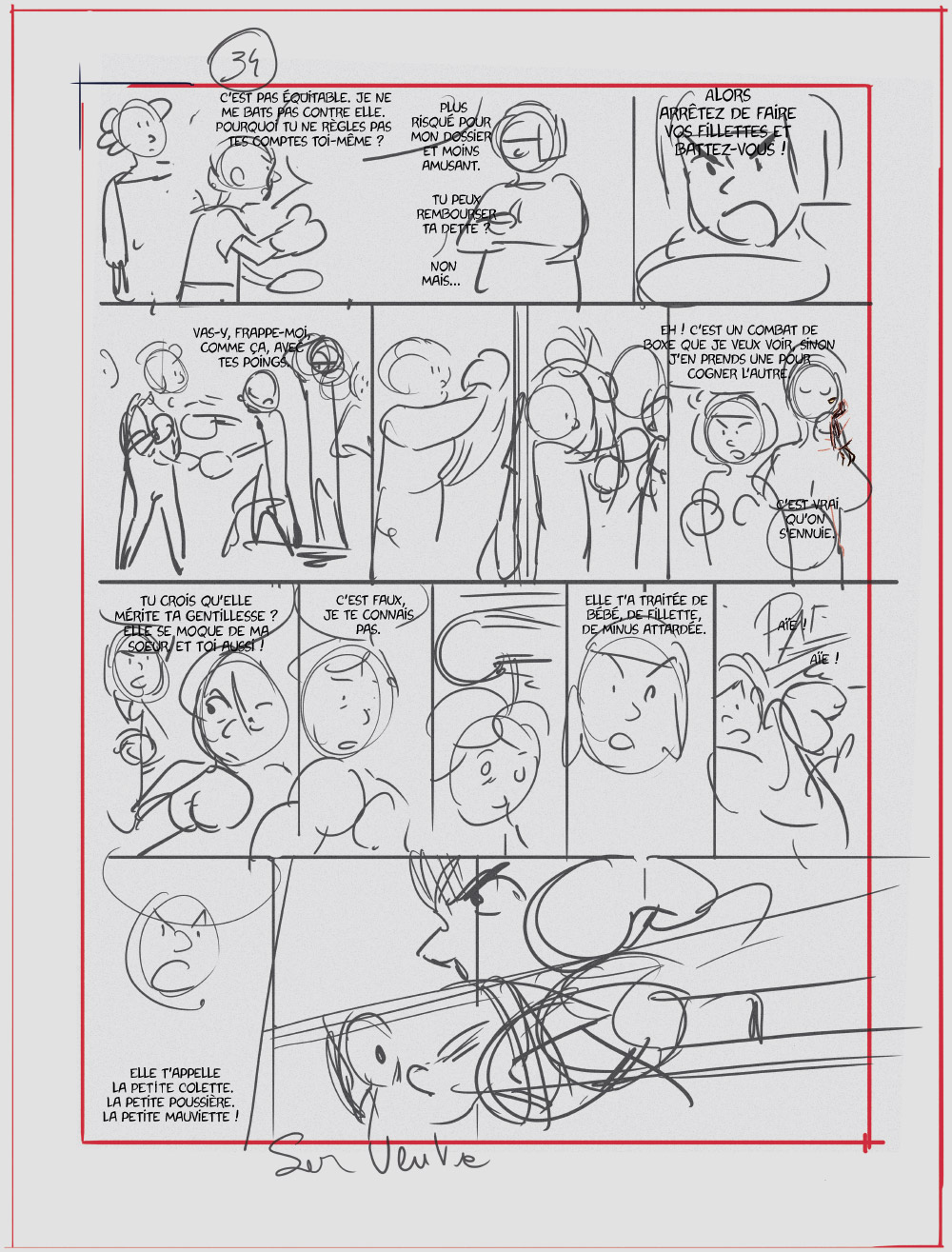 Véro Cazot : J‘avais un problème scénaristique à résoudre dans ce nouveau Mi-Mouche : comment faire boxer Colette alors que sa maman le lui a interdit ? Je l’ai résolu en approfondissant la thématique du harcèlement abordée dans le tome 1. Astrid va ici obliger Colette à se battre pour de surprenantes raisons… J’ai besoin de sept mois pour écrire un Mi-Mouche. Ça peut sembler long, mais c’est ce temps qui fait naître des interactions imprévues entre les personnages !