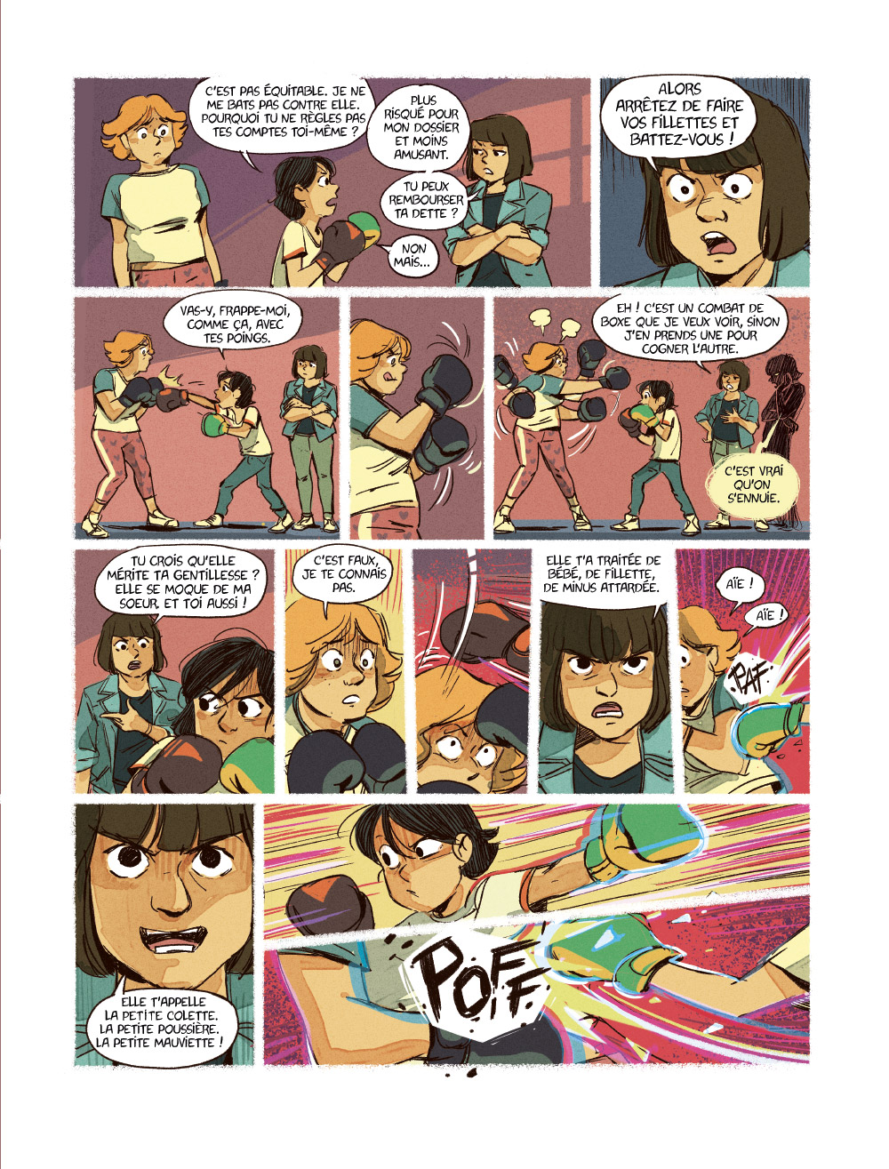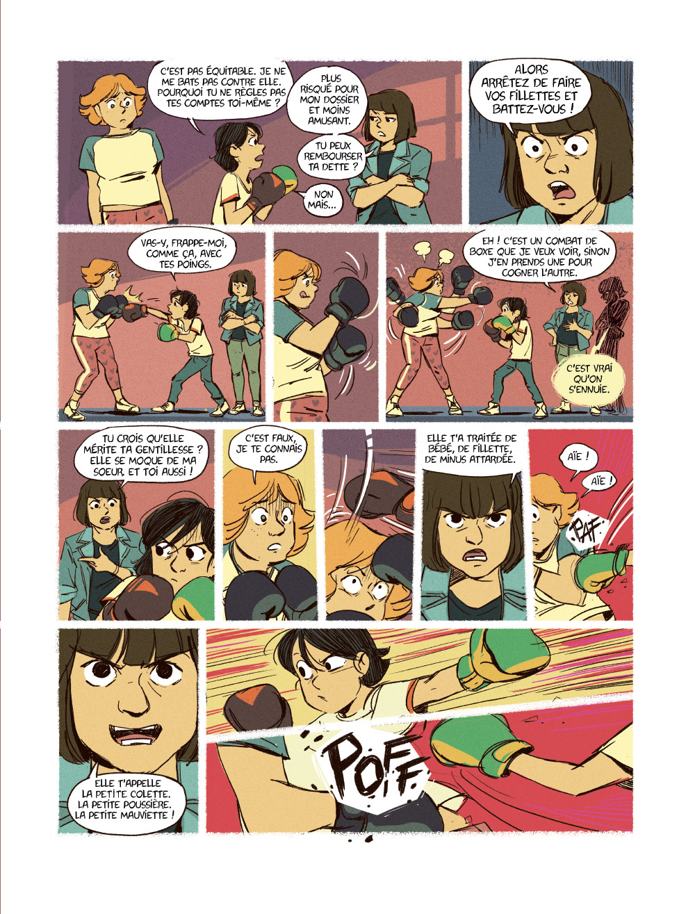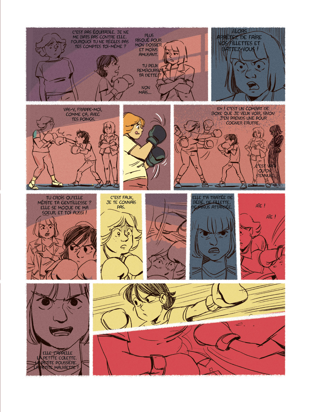 Carole Maurel : Lors d’une dédicace au Festival Spirou, Véro et moi avons même rencontré un boxeur. Comme j’ai pratiqué la boxe française, on a beaucoup discuté technique ! Mi-Mouche est mon premier pas dans la BD « d’action » ! Je suis plus habituée à travailler l’interaction des personnages à travers les regards, les cadrages… Je me suis donc beaucoup documentée pour les scènes de boxe, même si je connais les sentiments que provoque le combat. Je sais à quel point il faut être concentré sur le regard de l’autre, sur ses appuis, sans quoi on se prend un pain ! Pour me documenter, j’ai regardé à la fois des vidéos de professionnels et d’amateurs, afin de faire évoluer Colette au gré de ses progrès. Dans ses nouvelles aventures, elle va bouger différemment, de manière plus assurée !