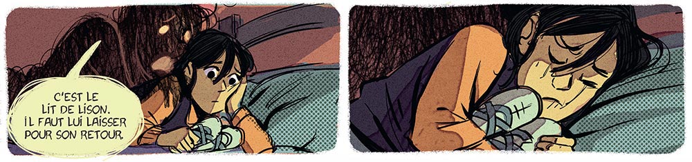 Vero Cazot : Colette vit dans l’ombre de Lison, sa sœur jumelle disparue dans un accident de voiture. Lison était son modèle, et Colette tente depuis de lui ressembler, au risque de s’oublier elle-même… C’est pourquoi elle fait de la danse alors qu’elle est attirée par la boxe ! Pour mettre en scène la dureté de l’absence de Lison, j’ai imaginé plein de petits détails. Comme son lit vide, à côté de celui de Colette…