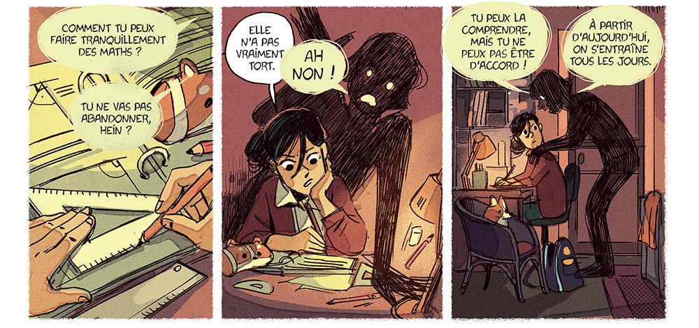 J’ai l’habitude de travailler sur des formats de page « adultes », c’est-à-dire avec trois strips. Pour Mi-mouche, qui est plutôt un format « franco-belge », il y a quatre strips. Ça n’a l’air de rien, dit comme ça, mais en réalité cela implique pour moi de découper différemment ma narration, avec des cadrages auxquels je suis moins habituée. Et comme il se passe plein de choses sur chaque planche, je ne peux plus avoir recours à des illustrations pleine page comme j’aime le faire d’habitude !
