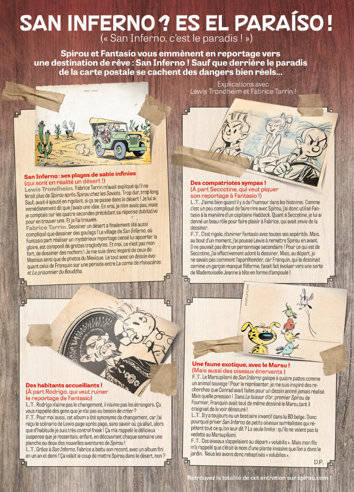 Cette semaine, dans le journal Spirou, Spirou et Fantasio vous emmènent en reportage vers une destination de rêve : San Inferno ! Sauf que derrière le paradis de la carte postale se cachent des dangers bien réels…