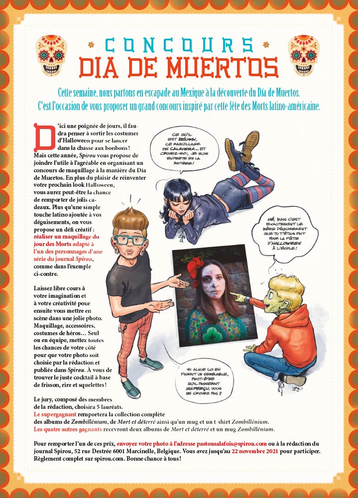 Cette semaine, le journal Spirou vous emmène en escapade au Mexique à la découverte du Día de Muertos. L’occasion de vous proposer un grand concours inspiré par cette fête des Morts latino-américaine.