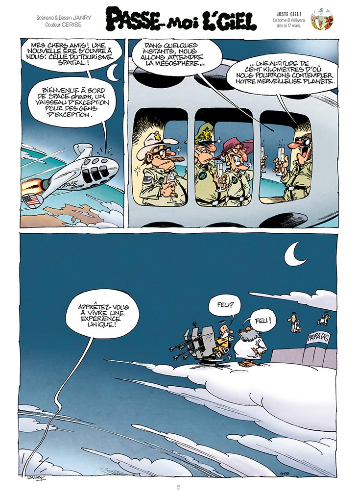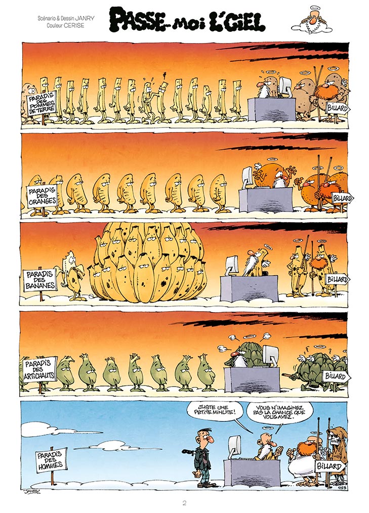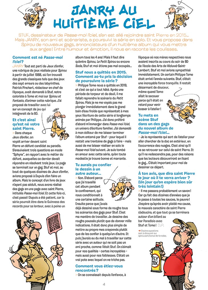 Stuf, dessinateur de Passe-moi l’ciel, s’en est allé rejoindre saint Pierre en 2015… Mais Janry, son ami et scénariste, a poursuivi la série en solo. Et vous propose dans Spirou de nouveaux gags, annonciateurs d’un huitième album qui vous mettra aux anges !