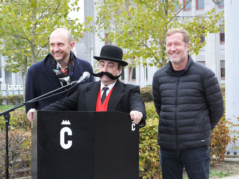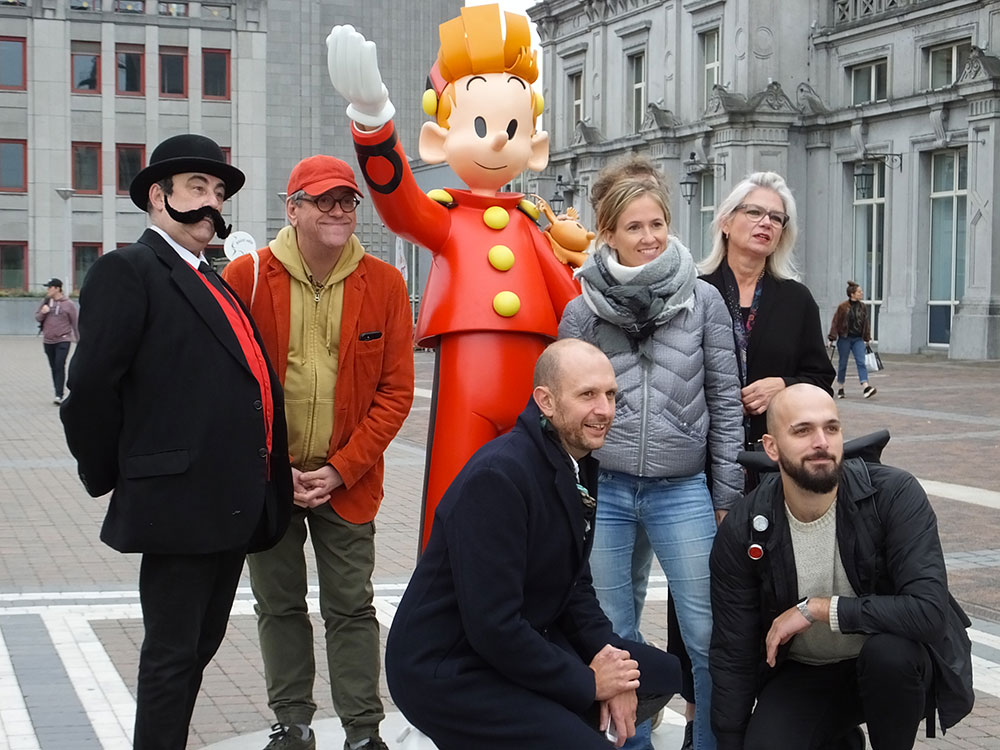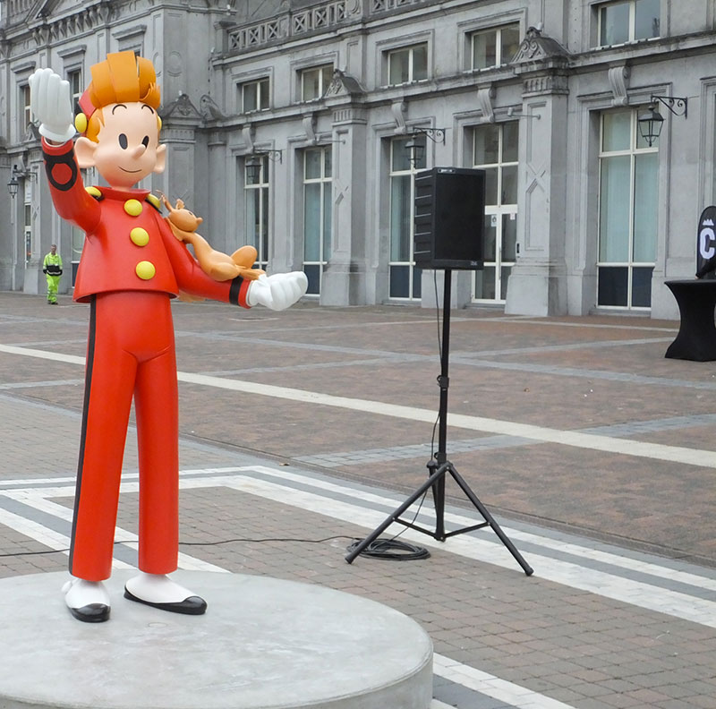 Vendredi 26 octobre, 11h : arrivée du maire de Champignac, suivi de sa fanfare, sur le parvis de la gare de Charleroi ! Mais que se passe-t-il ?! C’est bien simple, notre ami Gustave Labarbe nous dévoile une somptueuse statue de Spirou.