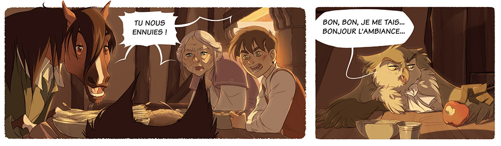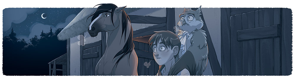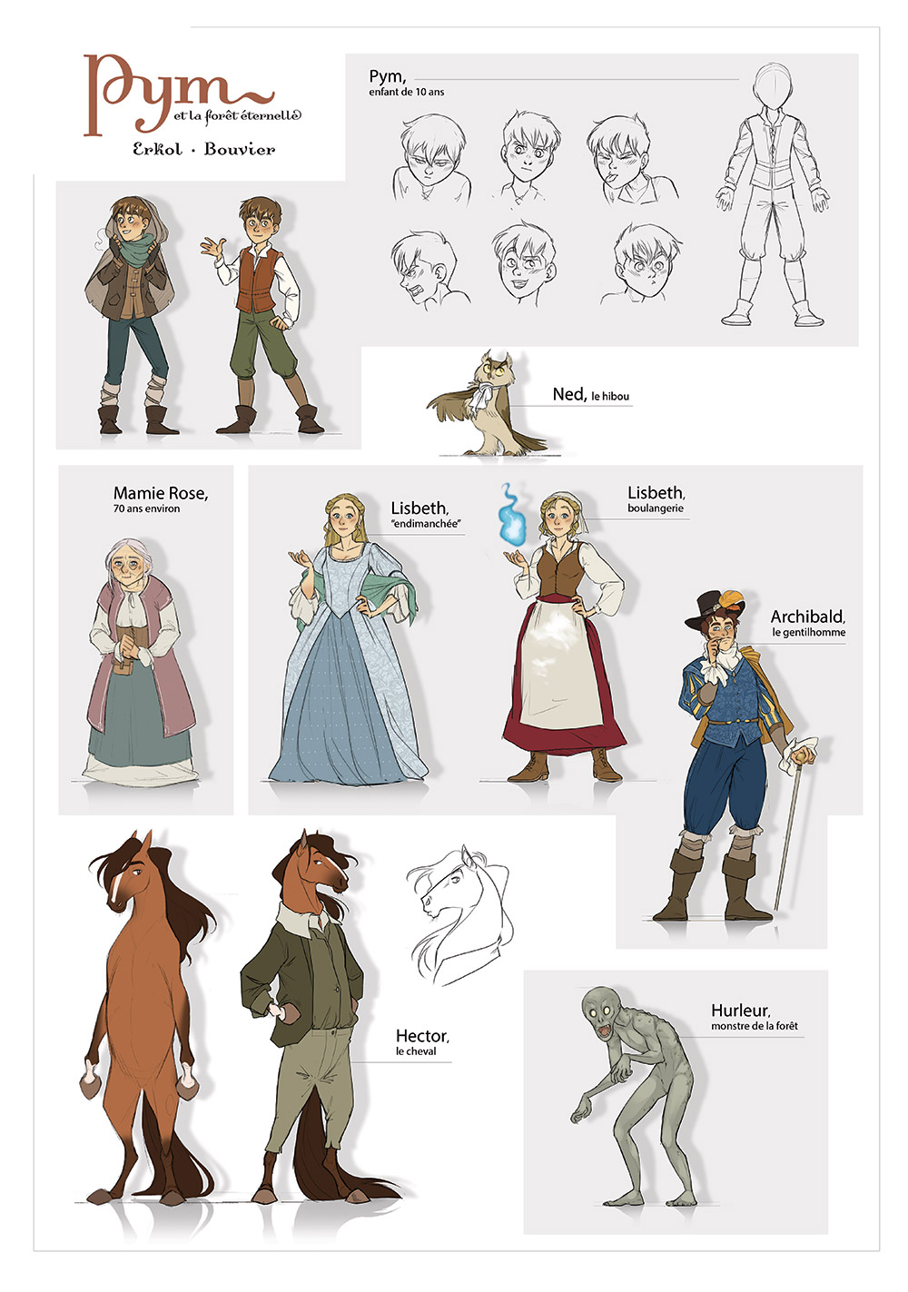 Fuat Erkol : Ça me semblait compliqué de meubler un huis clos dans la forêt avec juste Pym et sa mamie. Mais j’avais du mal à trouver des personnages secondaires. Jusqu’au jour où je suis tombé sur des jouets de ma fille qui traînaient : un cheval et un hibou. Ça a donné Hector, un cheval incapable de marcher autrement que sur deux pattes, et Ned, un hibou bavard et incapable de voler ! Hector est la conscience morale de Pym. Ned, lui, dit des vacheries et traite Rose de « vioque », par exemple. Il représente les aspects les plus méchants de mon caractère.
