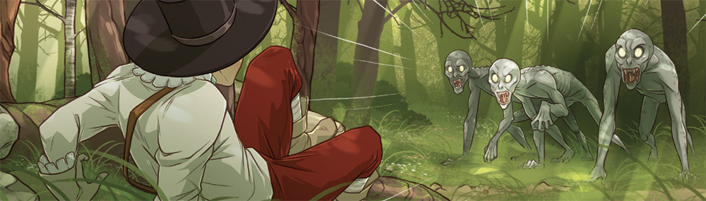 Clémentine Bouvier : La forêt autour de la chaumière de Pym est infestée de Hurleurs, des créatures qui dévorent l’âme des humains ! Pym en sait peu à leur sujet, car Fuat fait en sorte qu’il soit au même niveau d’information que les lectrices et lecteurs. Même à moi, il ne révèle les choses qu’au fur et à mesure ! Pour dessiner les Hurleurs, j’ai pris le personnage du Cri de Munch, auquel j’ai rajouté des dents et un petit côté Gollum.