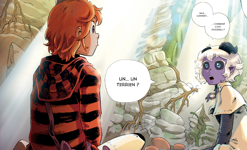 P.C. Sur les autres séries que je dessine, je travaille sur ordi à 100 %. Comme j’aime varier les techniques,je dessine Starlight en mode « traditionnel », avec papier, crayon et encre de Chine. Mais il m’arrive aussi d’utiliser des outils numériques pour retoucher certaines cases. Je réalise d’abord des story-boards bien poussés, que je scanne et que je nettoie. Je baisse la transparence du trait jusqu’à obtenir une couleur verte très claire, puis j’imprime les planches sur du grand format et j’encre par-dessus. Je rescanne ensuite ces planches au trait afin que Florence Torta y pose la couleur.