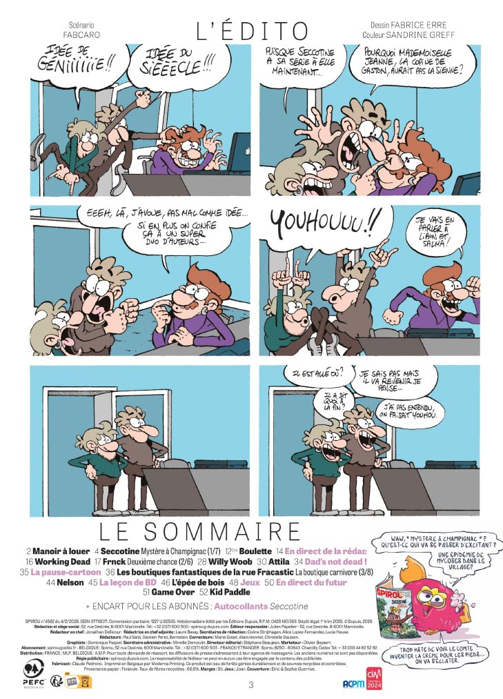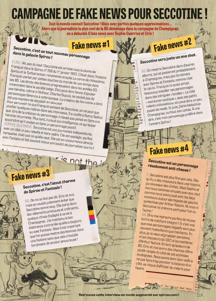Cette semaine, le journal Spirou accueille Seccotine, une journaliste intrépide et piquante, que les lecteurs des aventures de Spirou et Fantasio connaissent déjà. À peine installée dans la campagne paisible de Champignac-en-Cambrousse, Seccotine se retrouve entraînée dans une affaire de disparitions d’animaux…
