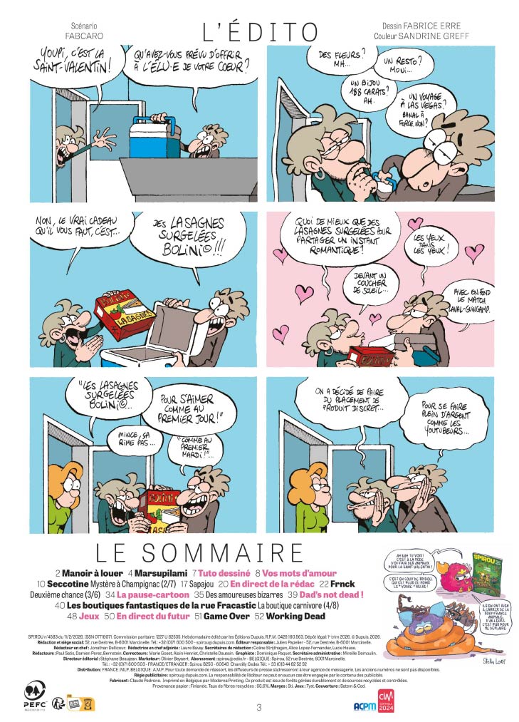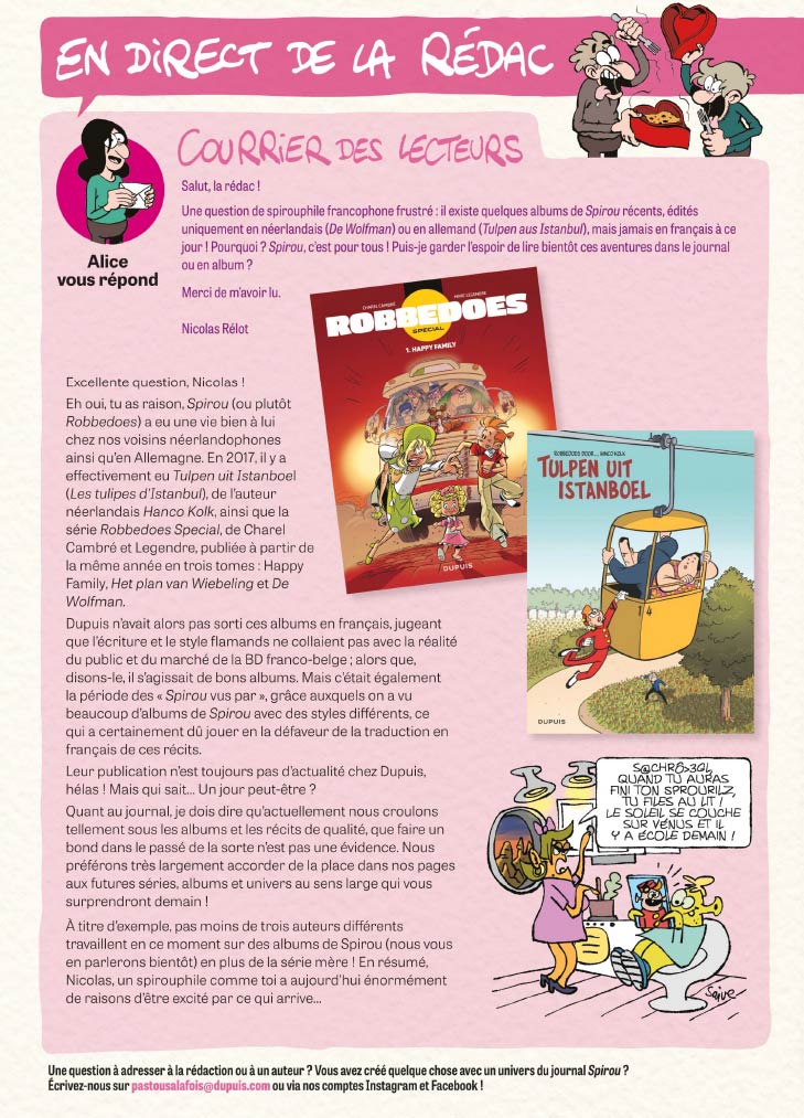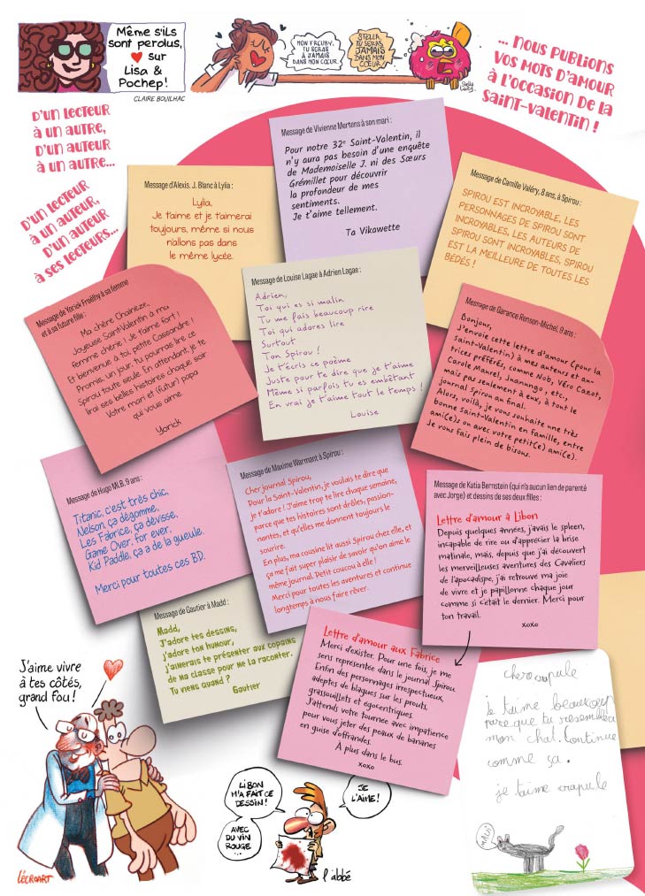 Cette semaine, c’est l’Amour avec un grand A qui est au menu du journal Spirou qui vous propose un numéro spécial Saint-Valentin. Vous y découvrirez les mots d’amour des auteurs et des lecteurs récoltés depuis quelques semaines.