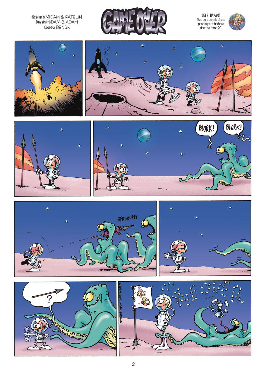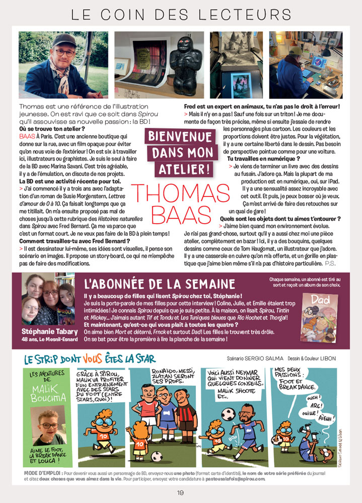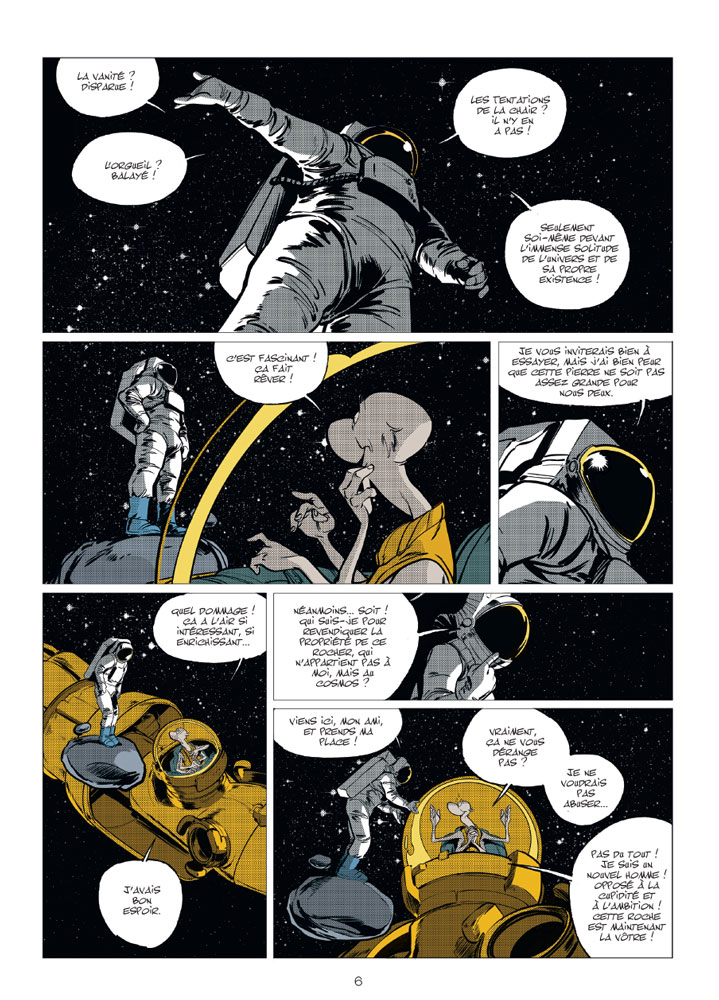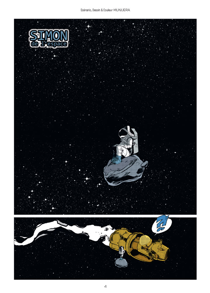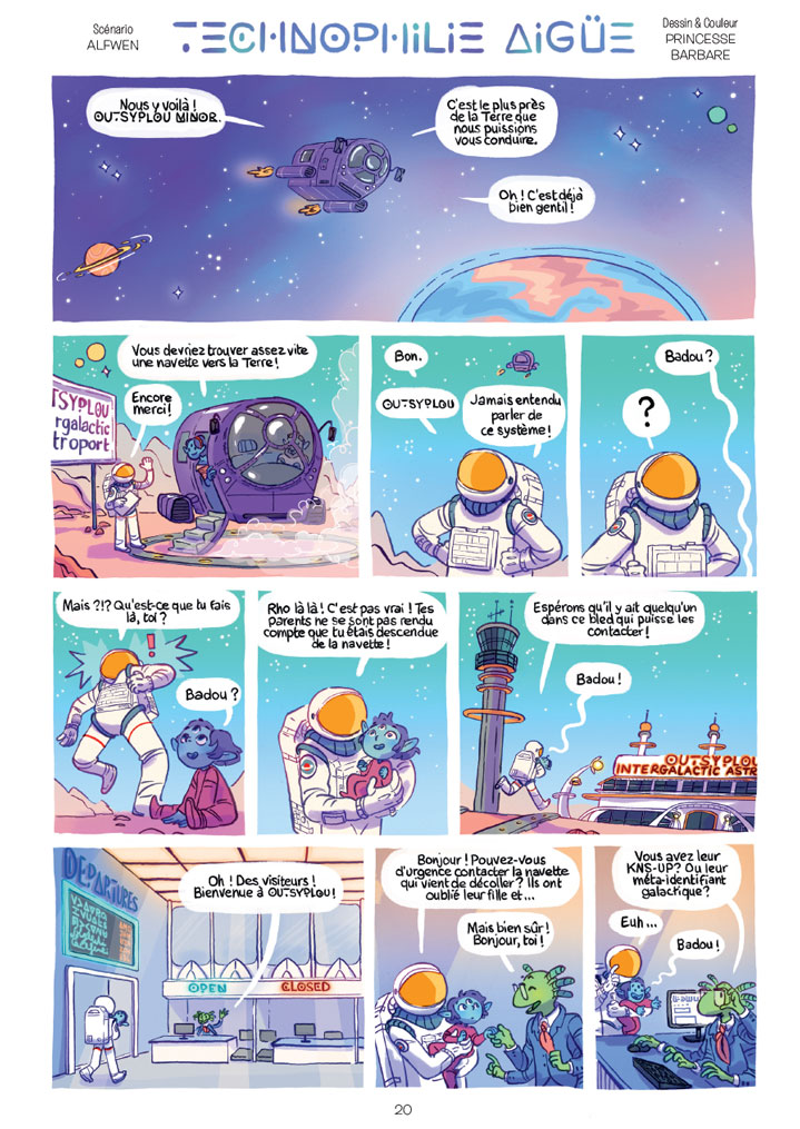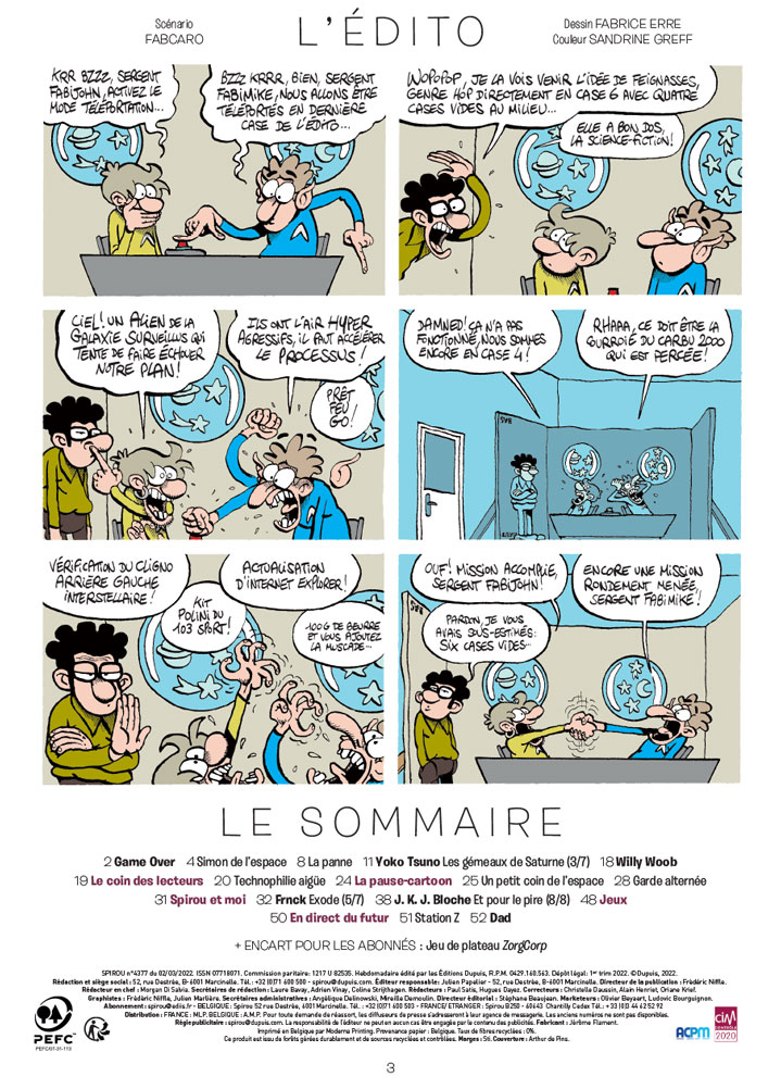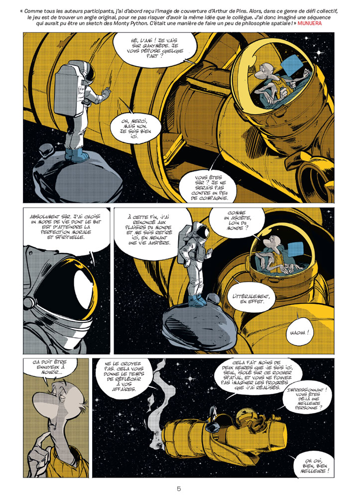 Nous avons confié la mission à Arthur de Pins de réaliser un dessin de couverture comme point de départ pour les histoires des autres participants au numéro spécial science-fiction du journal Spirou. Une fois l’image achevée, cinq équipes se sont formées pour nous raconter diverses péripéties liées à cette escale spatiale…