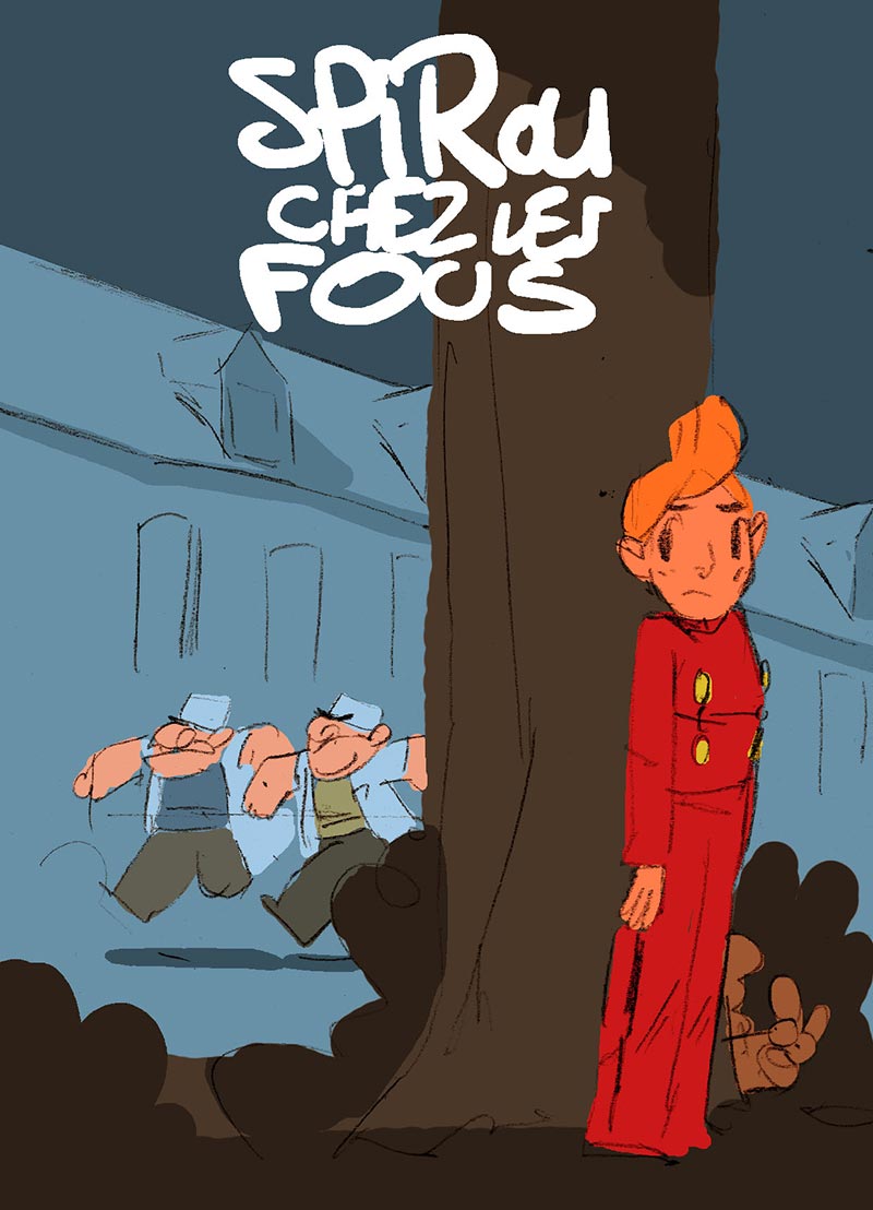 Libon : Dans mes productions habituelles, je raconte des histoires naïves, qui nécessitent donc des environnements naïfs. « Spirou chez les fous » réclamait des lieux plus identifiables, afin que le lecteur ne soit jamais perdu et sache toujours où l’on se trouve, en l’occurrence pour une large partie à Angoulême. J’aurais toutefois pu dessiner une Angoulême fantasmée. J’ai préféré passer du temps sur Streetview, à me balader par écran interposé dans les petites rues de la ville. J’ai ainsi découvert des coins que je n’avais pas vus lors de mes visites au festival !
