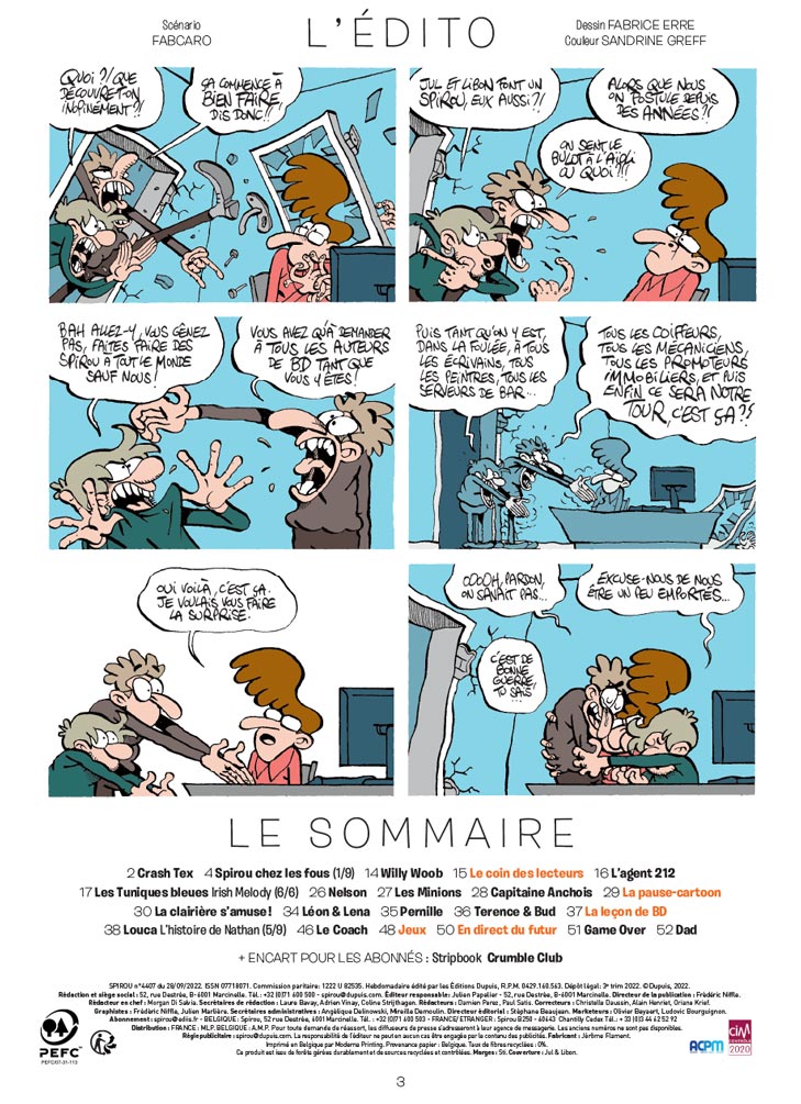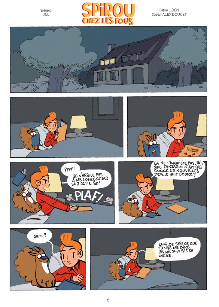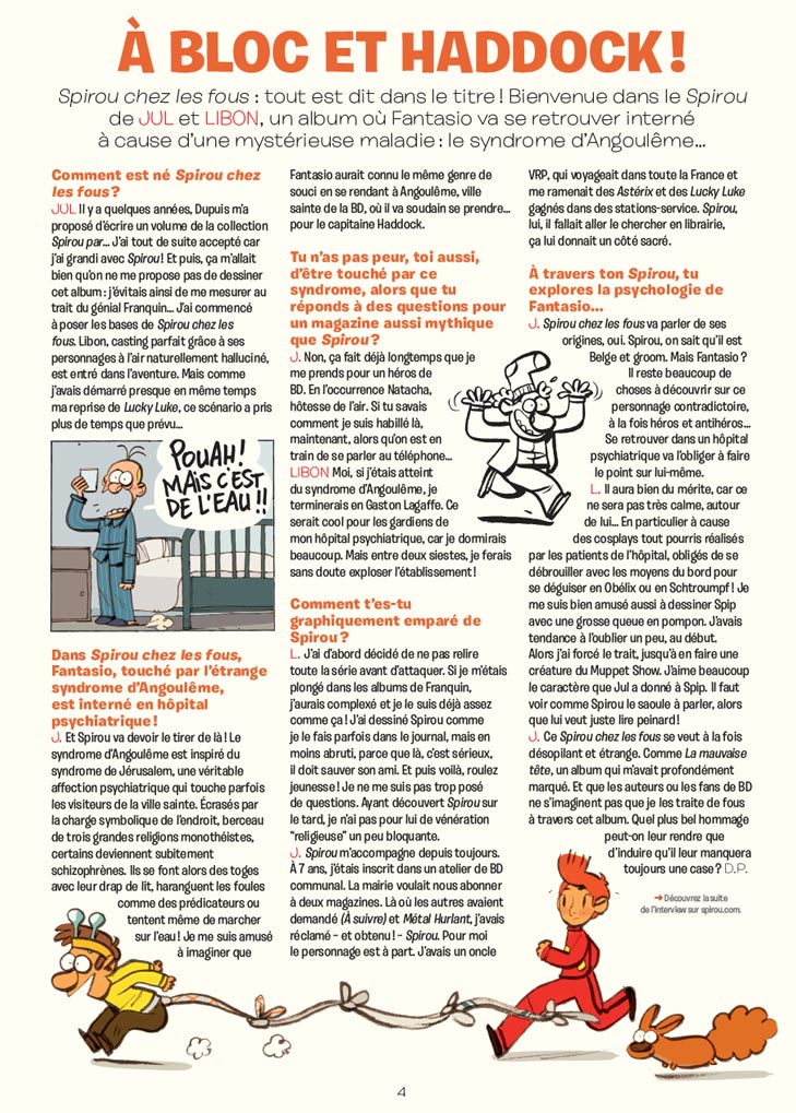 « Spirou chez les fous » : tout est dit dans le titre ! Bienvenue dans le Spirou de Jul et Libon, dont vous pourrez découvrir le premier épisode dans le journal Spirou cette semaine. Un album où Fantasio va se retrouver interné à cause d’une mystérieuse maladie : le syndrome d’Angoulême…