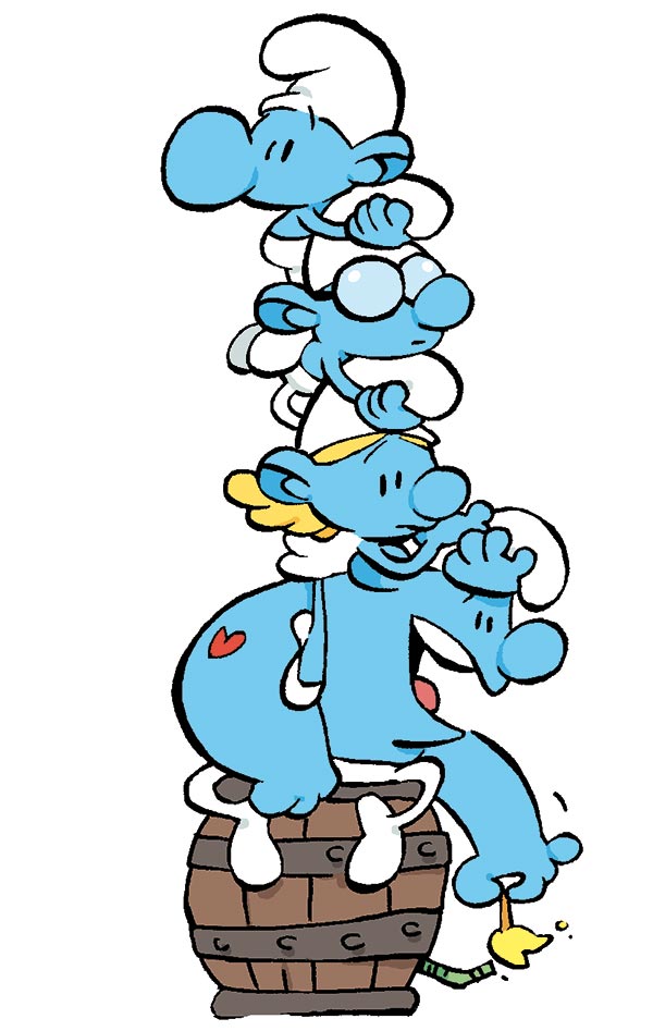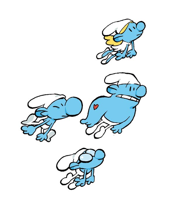 Au départ, j’ai commencé à les dessiner comme Mickey dans « La jeunesse de Mickey », avec les mêmes proportions, leur donnant des bras très longs. Mais ça ne fonctionnait pas. J’ai beaucoup tâtonné, car je voulais mes Schtroumpfs déconnants mais mignons. Pour leur visage, je me suis inspiré de Peyo, avec une tête qui ne se déforme pas sous les émotions, ces dernières étant véhiculées par la seule forme de la bouche. J’ai par contre galéré avec les mains à quatre doigts qui, quand je les dessinais fermées, ressemblaient à des moignons. Mais une fois que j’ai eu l’impression de maîtriser mes Schtroumpfs, c’était vraiment cool de les dessiner !