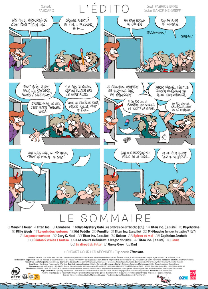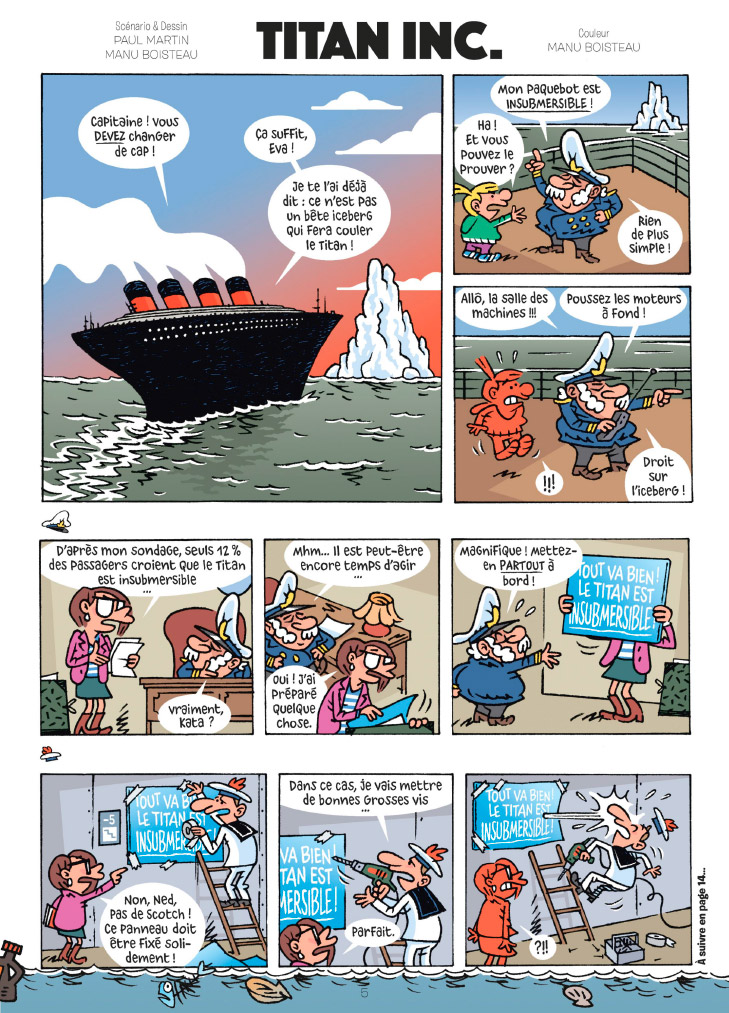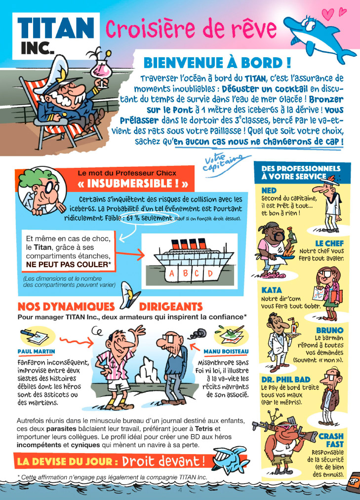 Cette semaine, le journal Spirou vous offre un croisière de rêve à bord du Titan. C’est l’assurance de moments inoubliables : déguster un cocktail en discutant du temps de survie en eau glacée, bronzer sur le pont à 1 mètre des icebergs à la dérive… Bon voyage !