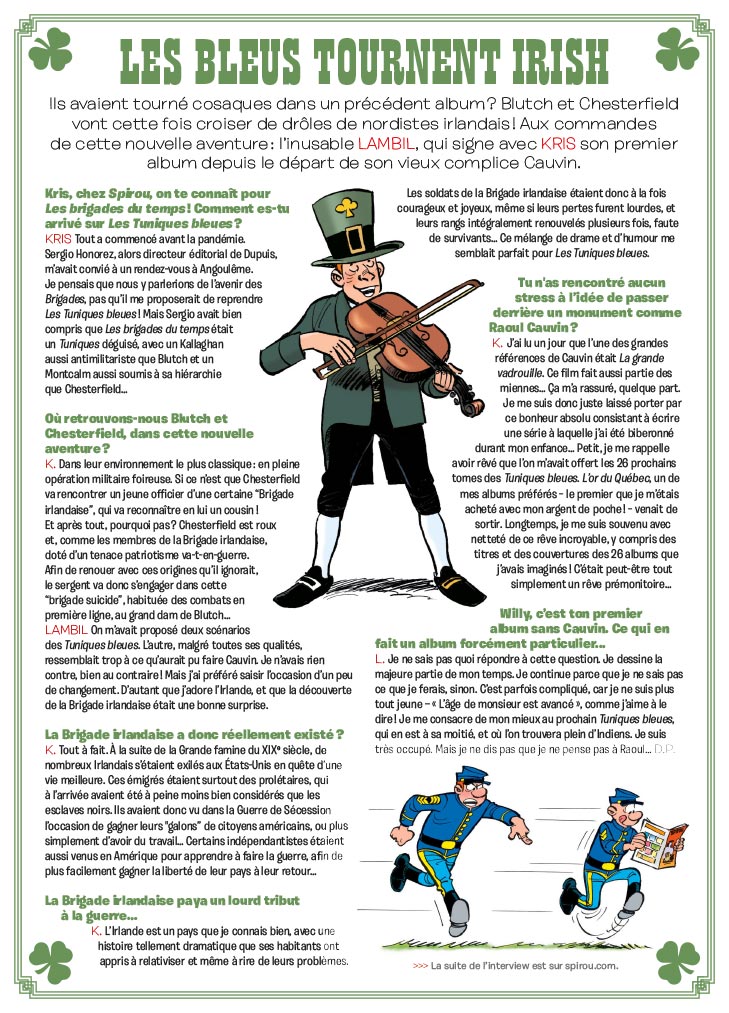Ils avaient tourné cosaques dans un précédent album ? Blutch et Chesterfield vont cette fois croiser de drôles de nordistes irlandais ! Aux commandes de cette nouvelle aventure dont le premier épisode est à découvrir dans le journal Spirou cette semaine : l’inusable Lambil, qui signe avec Kris son premier album depuis le départ de son vieux complice Cauvin.