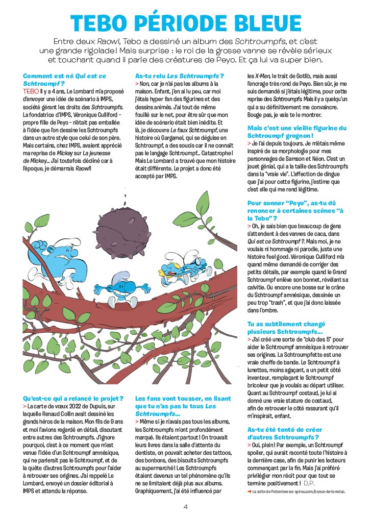 Entre deux Raowl, Tebo a dessiné un album des Schtroumpfs, et c’est une grande rigolade ! Mais surprise : le roi de la grosse vanne se révèle sérieux et touchant quand il parle des créatures de Peyo. Et ça lui va super bien. On vous laisse découvrir cela dans le journal Spirou cette semaine !