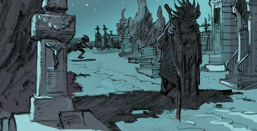 Denis Bodart. La maison menaçante sur une falaise est un archétype que l’on retrouve souvent, par exemple, dans les films de Tim Burton. Celle de notre sorcière devait donner un sentiment de vertige au lecteur. Je la voulais inquiétante et inaccessible, sans quoi le fait que Louis veuille s’y rendre n’aurait rien eu d’exceptionnel ! Je me suis inspiré des maisons que l’on voit sur les hauteurs de Namur et Bouge, en Belgique. Enfant, j’ai moi-même vécu dans ce genre de bâtisse !