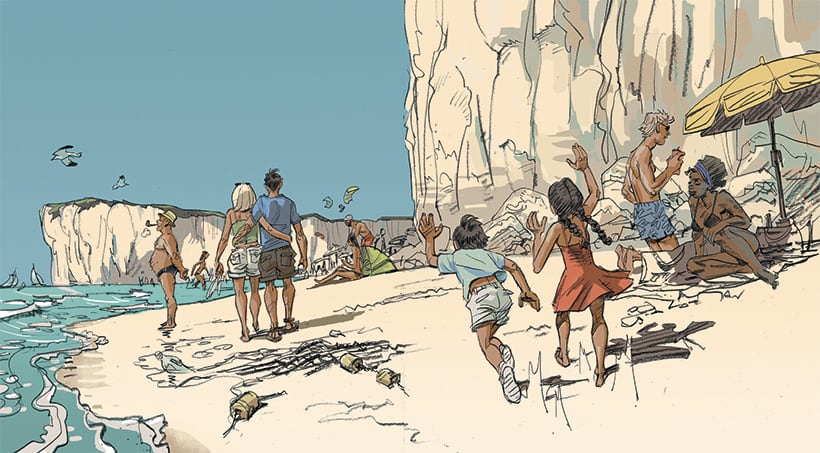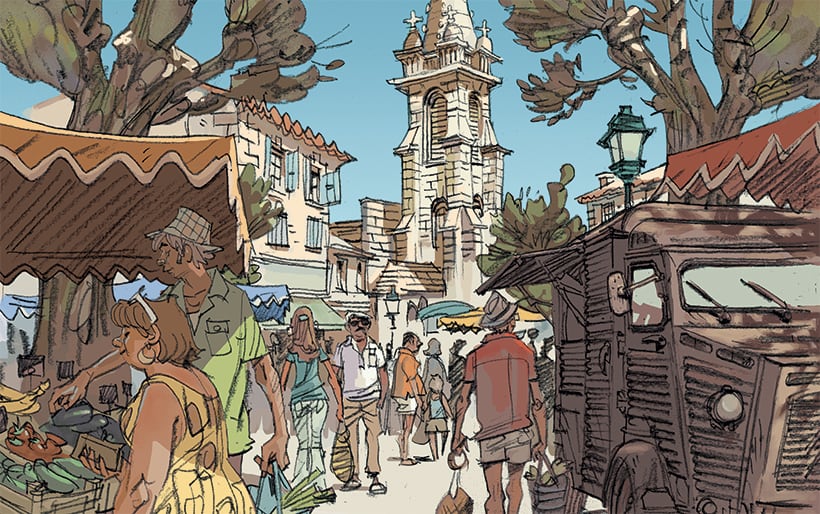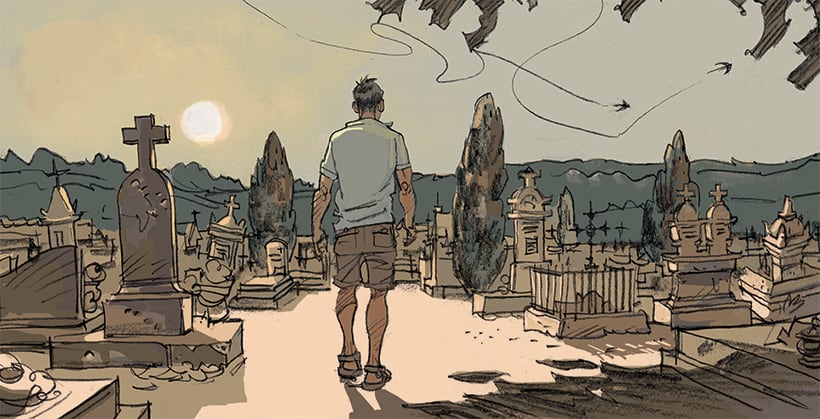 D.B. Notre envie était d’orchestrer une opposition entre la noirceur de certains éléments de la vie de Louis et les couleurs chaudes de ses vacances d’été. Pour composer la petite ville où Louis réside, j’ai d’abord listé les éléments dont le scénario avait besoin, comme un cimetière ou un pont de fer. Puis je me suis inspiré en vrac de la ville de Port-en-Bessin, de la Côte d’Opale, d’Étretat, de la Gironde, mais aussi du sud de la France pour la chaleur et la couleur des pierres des maisons.