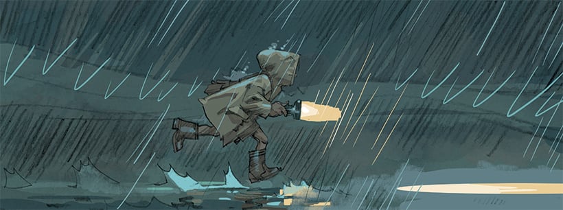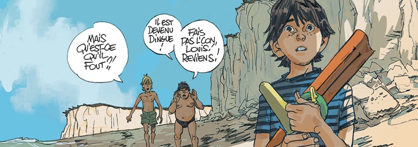 D.B. Les éléments vont se déchaîner dans Si je t’écris… Car Louis, qui va désobéir à son père et sortir en pleine tempête, va prendre de gros risques. Et c’est tant mieux, car sans obstacles, pas d’héroïsme ! Pour dessiner Si je t’écris…, j’ai poussé très loin mon crayonné plutôt que de faire un encrage traditionnel. Ça m’a obligé à énormément nettoyer mes planches. Sauf celles de tempête, où toute la « crasse » graphique correspondait bien à la furie des éléments !