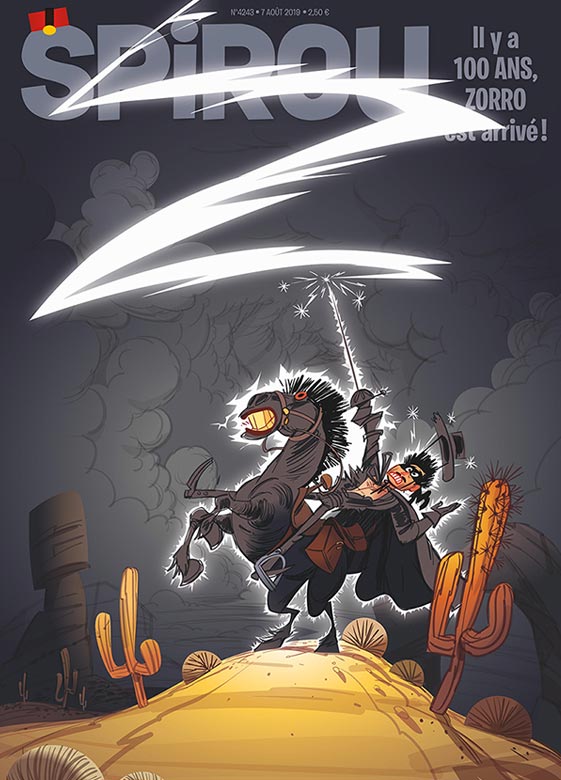 Cette semaine, le journal Spirou célèbre les 100 ans de Don Diego de la Vega, alias Zorro, le plus ancien des justiciers masqués. Plusieurs histoires courtes, rubriques et gags sont dédiés au cavalier qui surgit hors de la nuit !